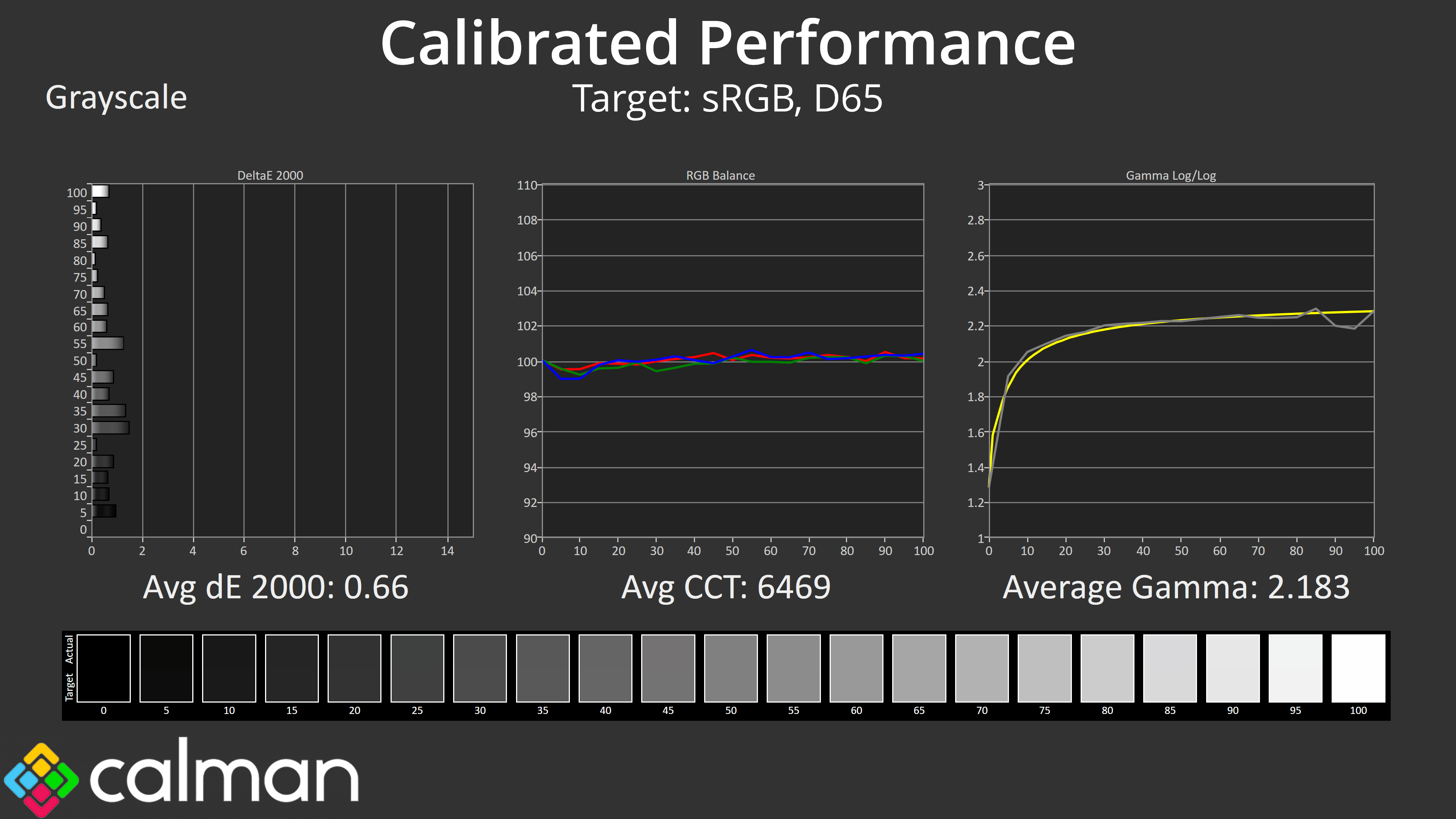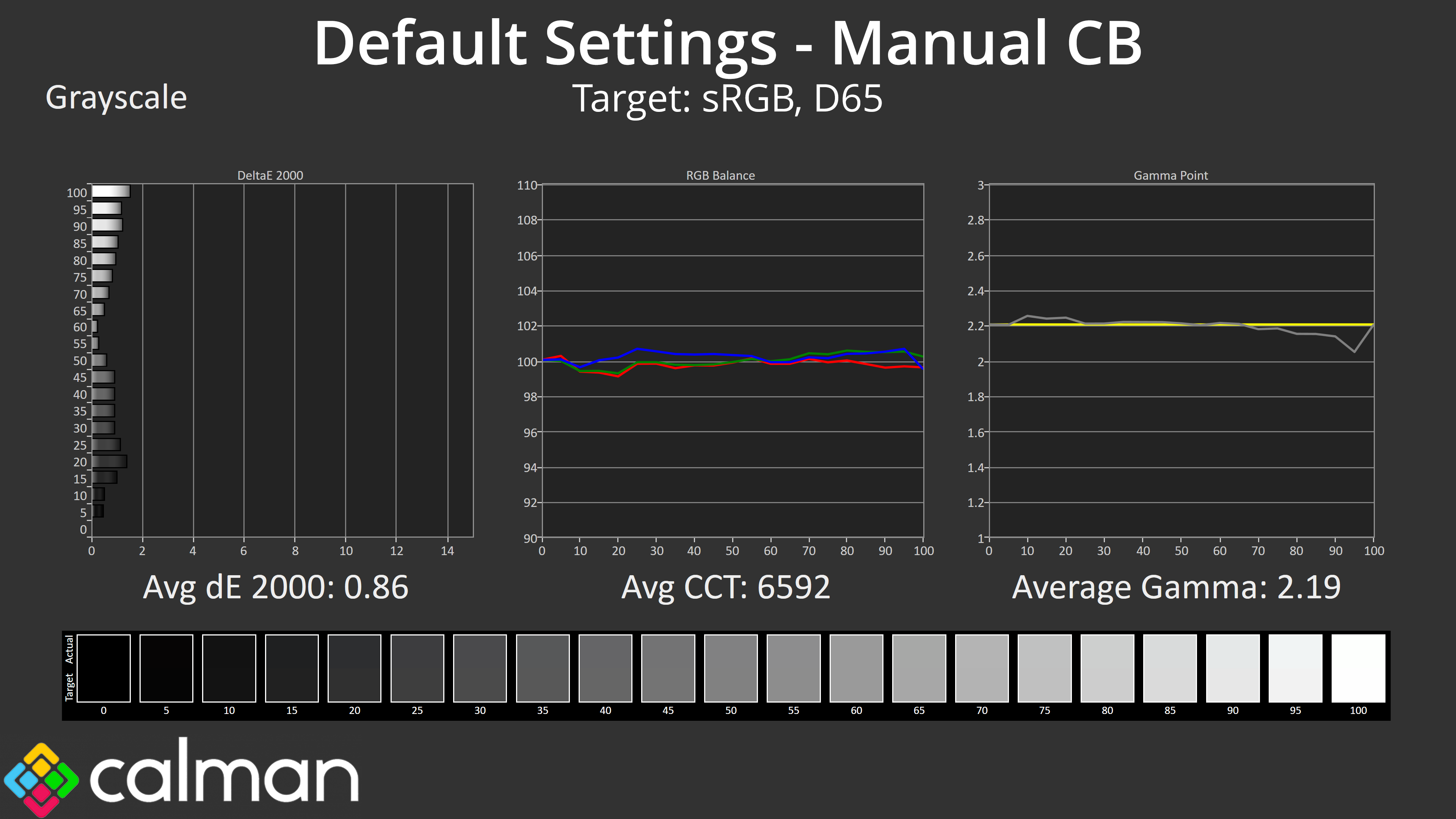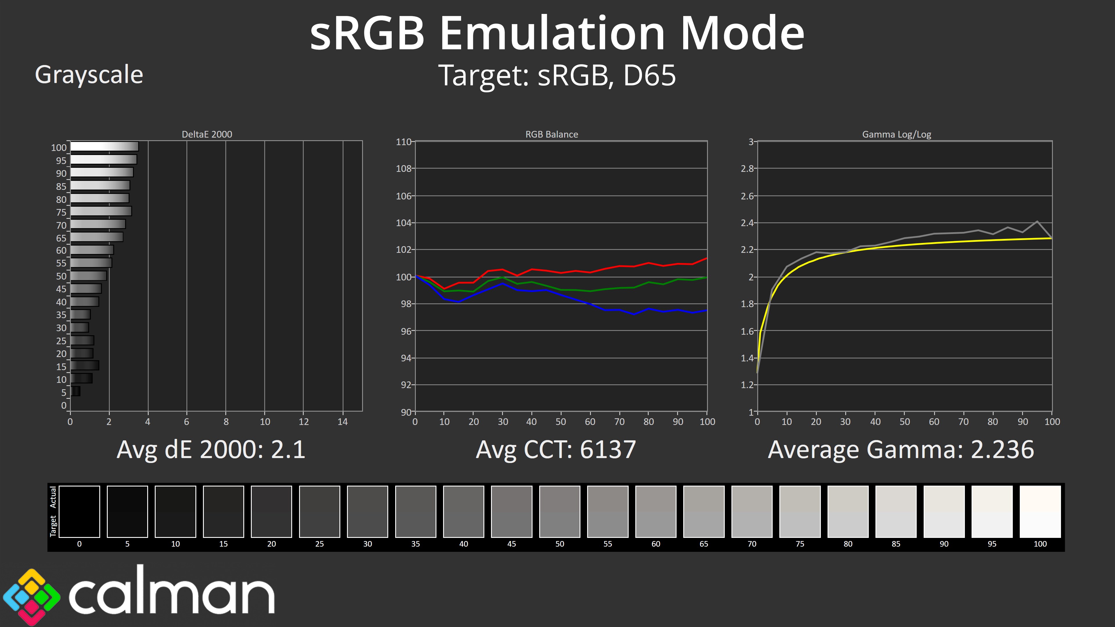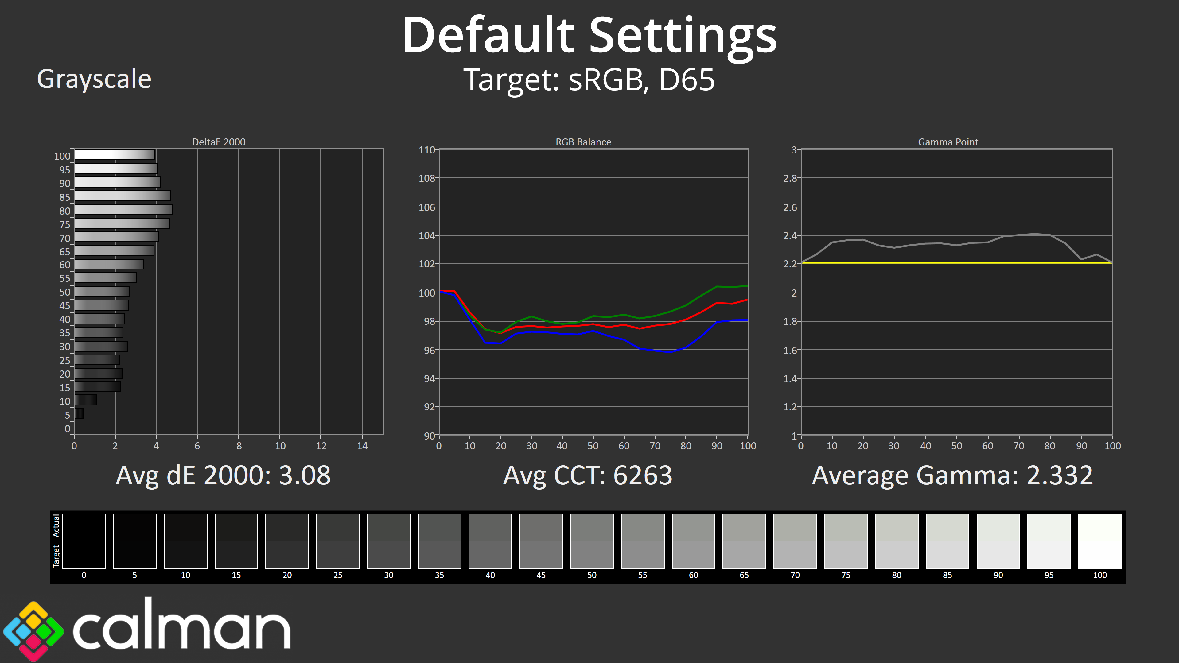 - Greyscale accuracy, measured across 20 shades, with an average colour balance reported.