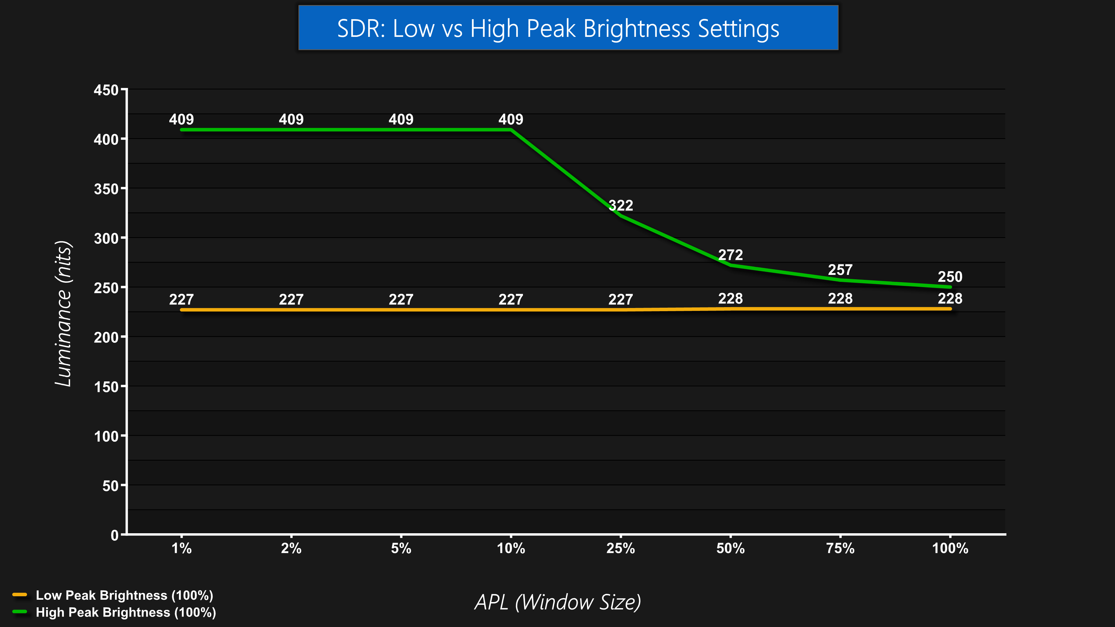 The High Peak Brightness mode does raise overall peak brightness, up to 409 nits for the 1-10% APLs. However, the Auto Brightness Limiter (ABL) kicks in after that, reducing brightness to 250 nits for a full screen white, which is typical of an OLED.
