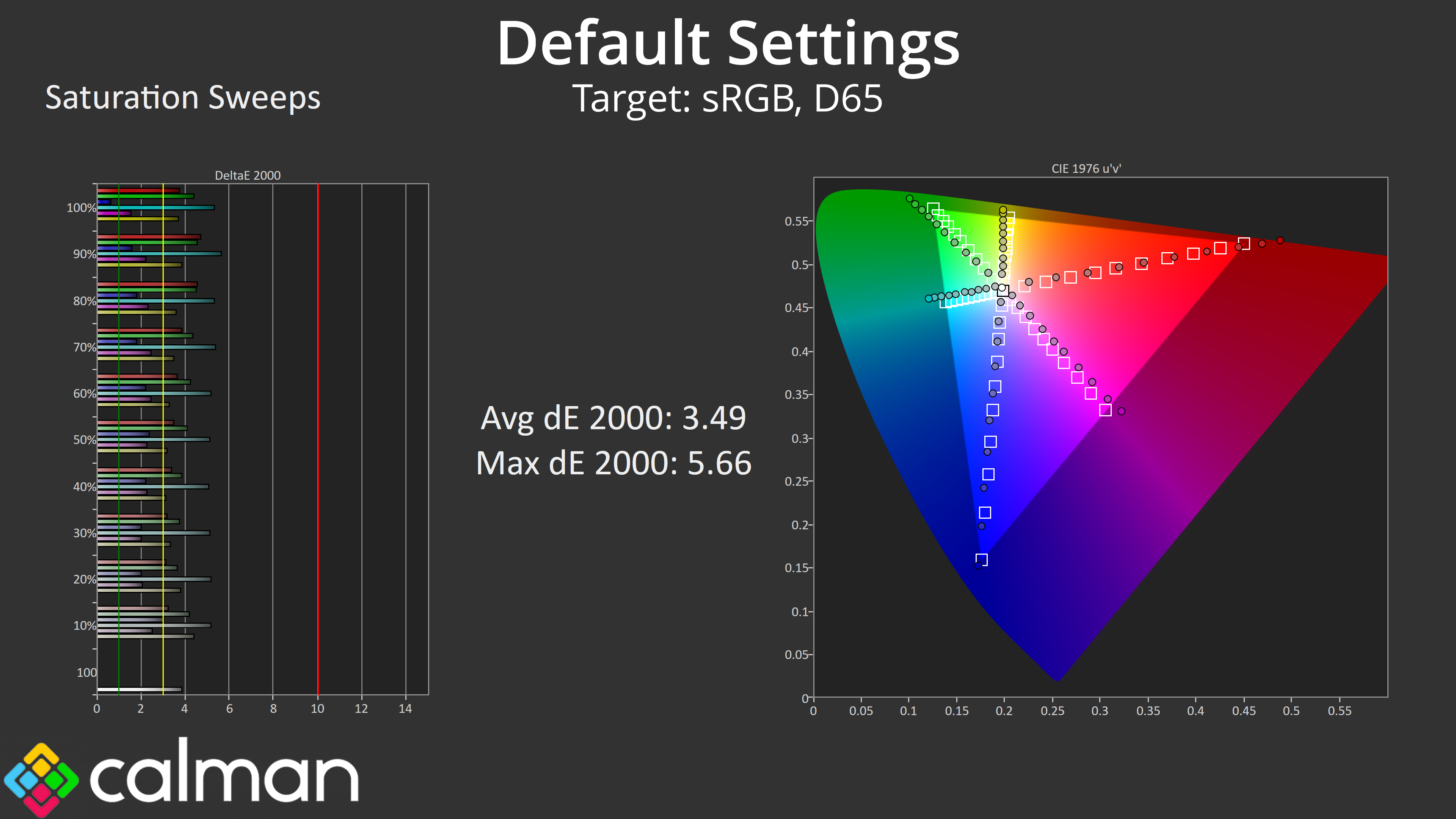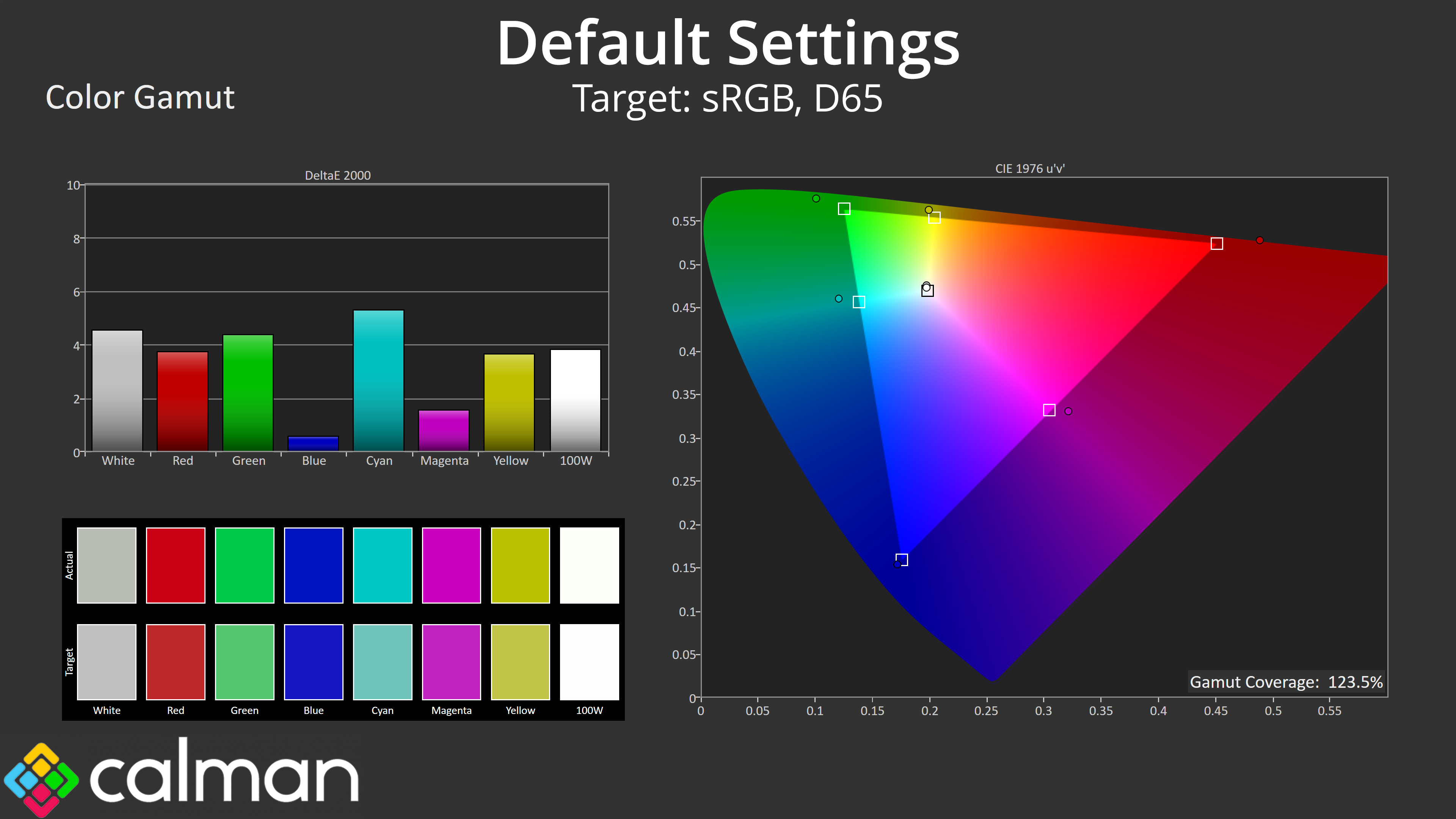 We first run these tests with the display in its out-of-the-box state, with all settings on default. If there is an sRGB emulation option or other useful mode then we may test that too. We then calibrate the screen using the Calman Ultimate software and run the tests again.
