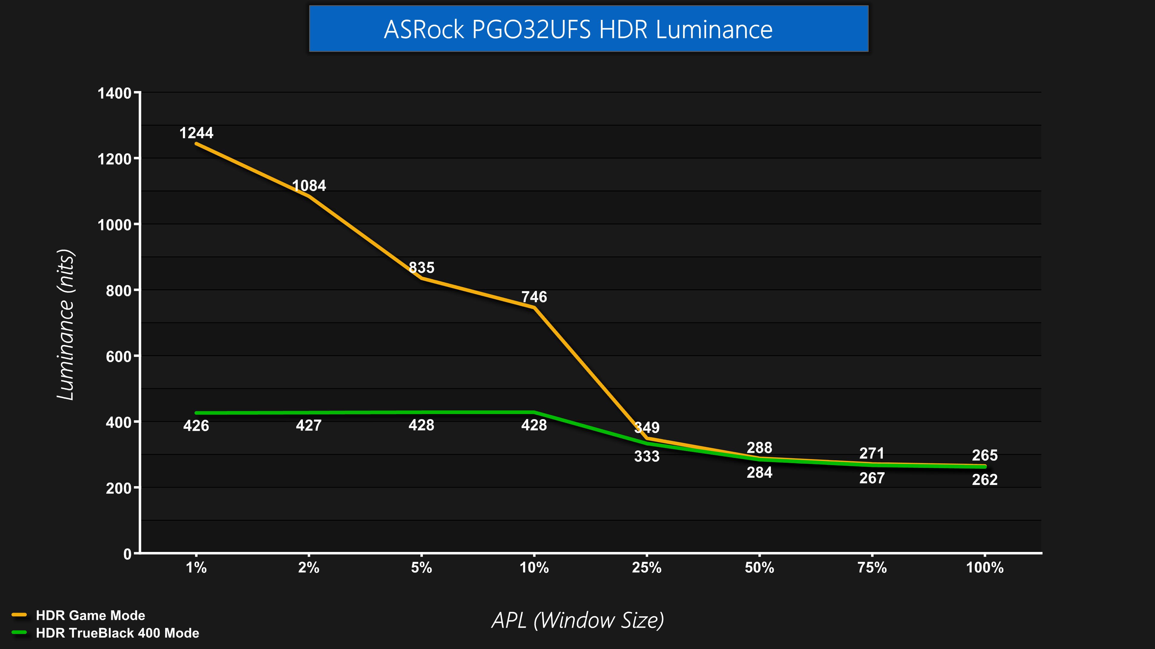 In terms of brightness, it goes about how you'd expect – the TrueBlack 400 mode is much dimmer, hitting a peak of just under 430 nits. The HDR Game mode is significantly brighter, peaking at 1244 nits in my testing, though only for the 1% APL, and it quickly drops off as the window size increases (which is perfectly normal for OLED screens).