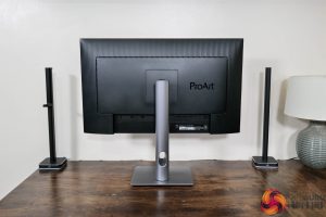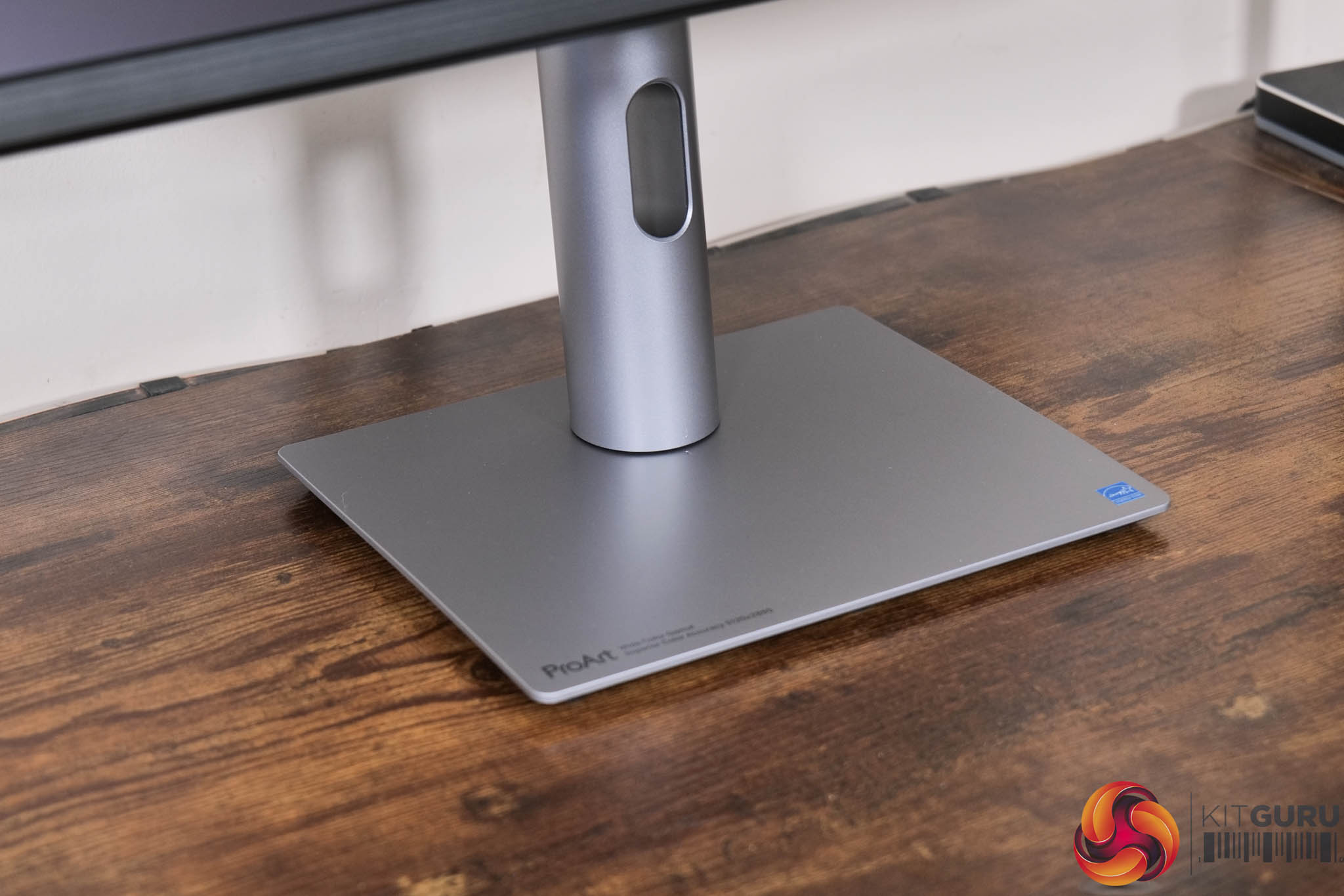 Round the back, the rear is mostly matte black plastic, but with some textured design elements which add visual interest. The ProArt logo is also positioned to the right of the stand. ASUS has also opted for a compact rectangular foot, and this measures approximately 22.7cm across and 18.9cm deep, so it doesn't take up much room at all.