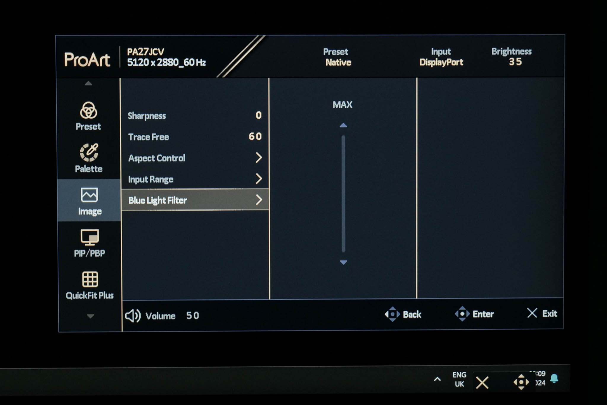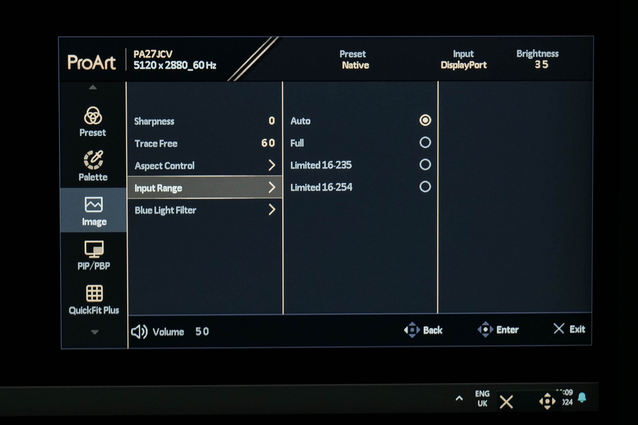 Then there are the Image settings, which includes sharpness, Trace Free (ASUS' term for overdrive), aspect ratio adjustment, input range control, alongside a blue light filter.