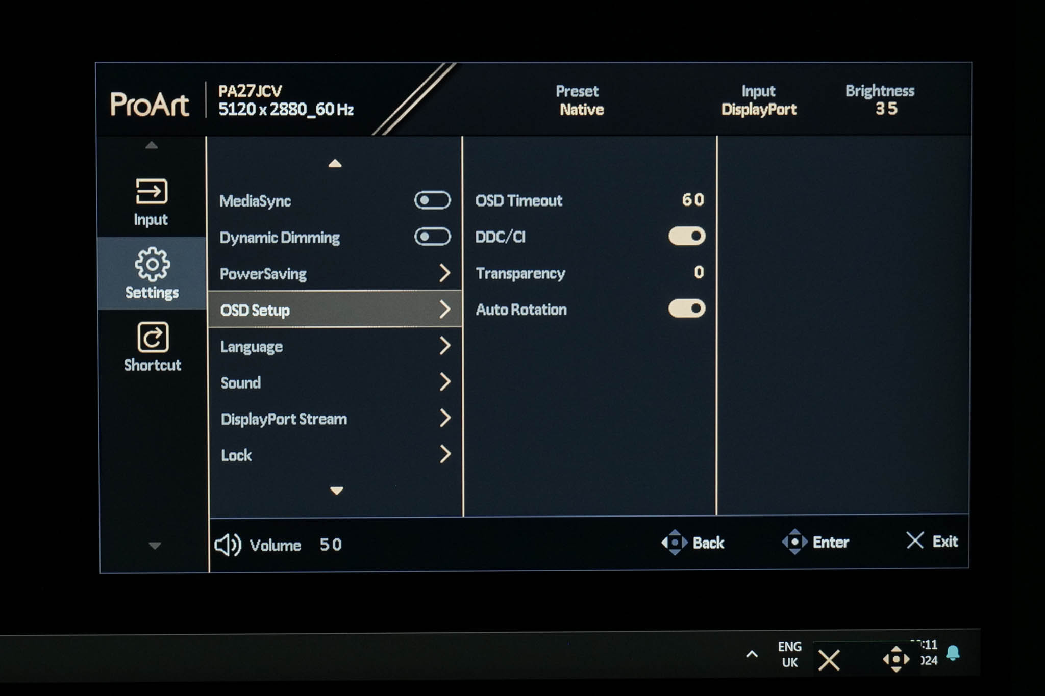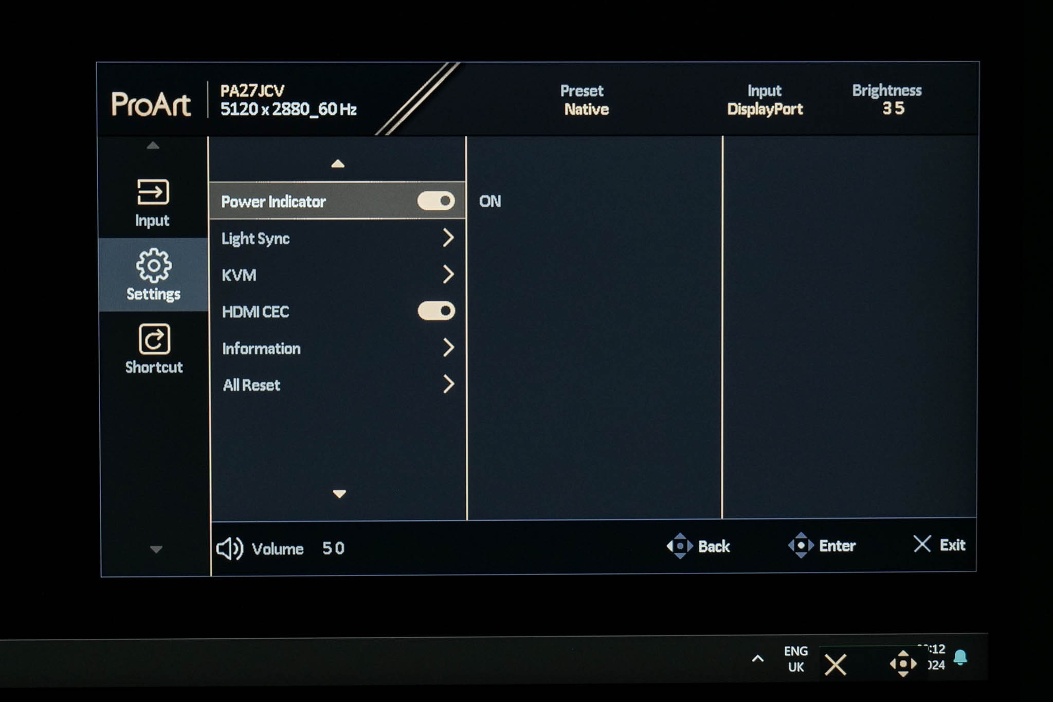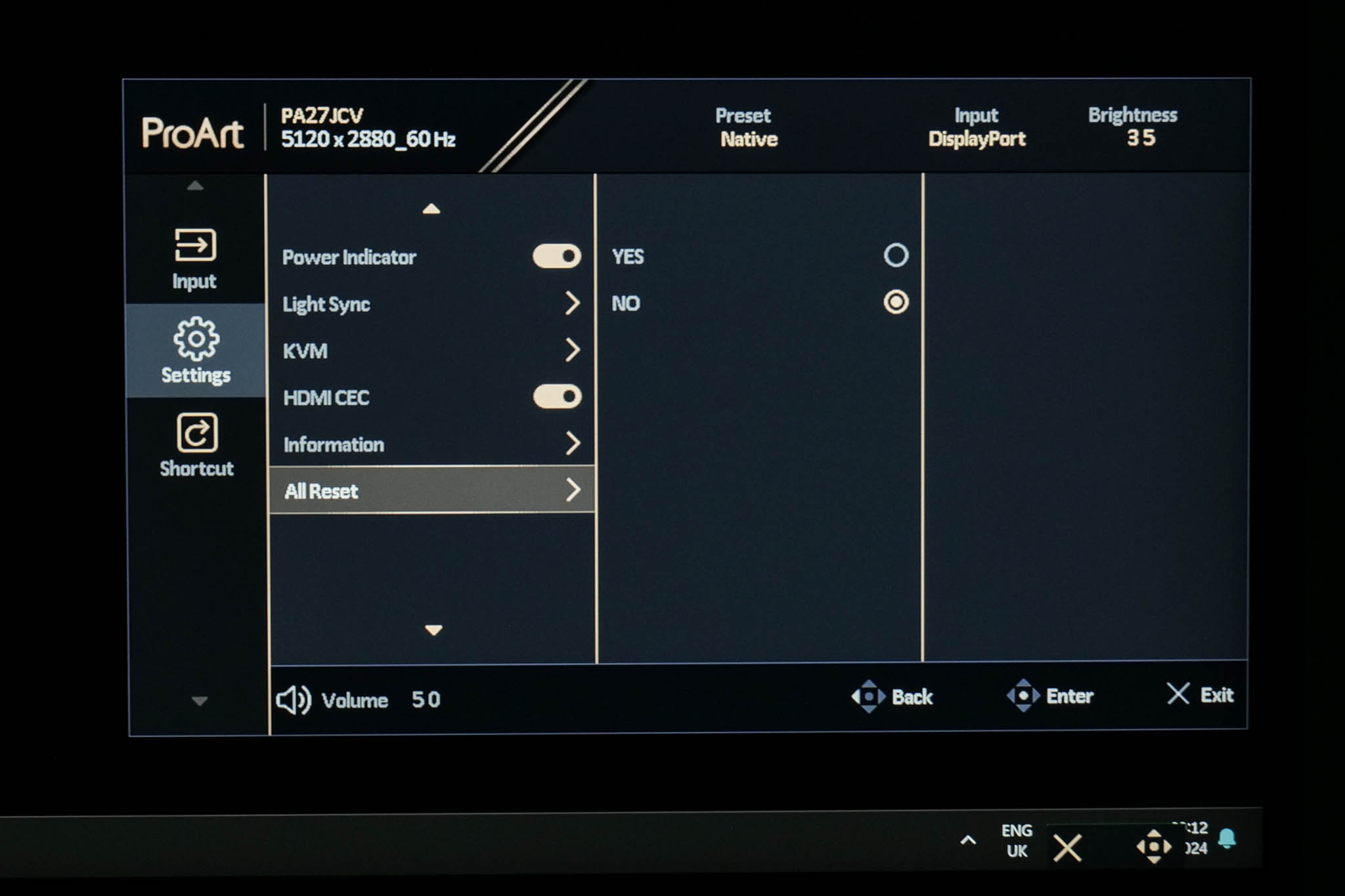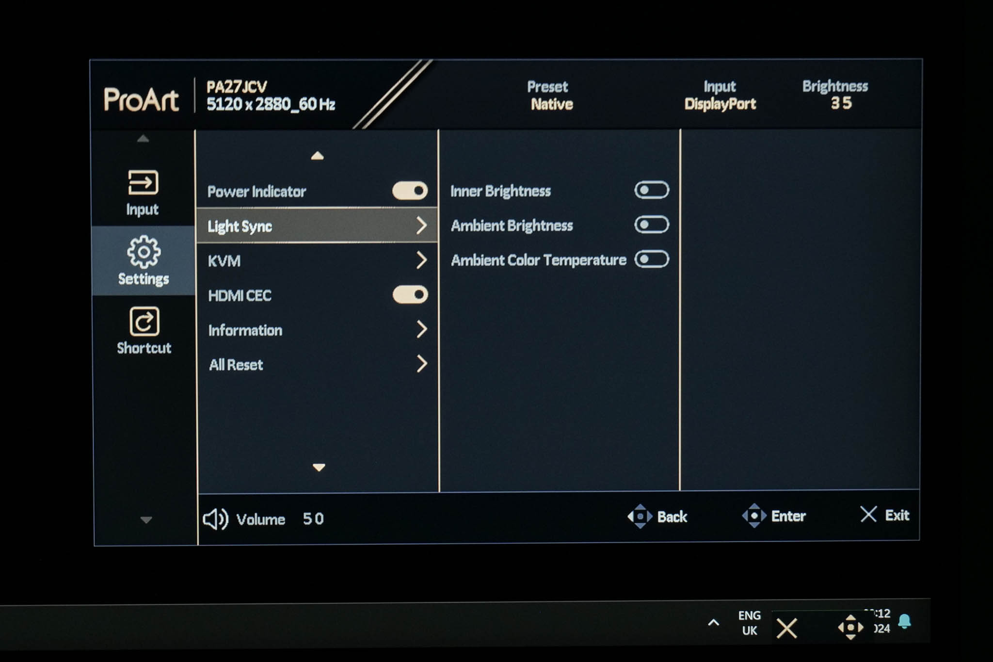 Settings has the most, erm, settings to adjust and it's quite a varied spread. There are basic things like OSD timeout options, but also more advanced features including KVM setup, DisplayPort configuration and ASUS Light Sync, the latter being an interesting feature which leverages ambient light and backlight sensors to automatically fine-tune gamut and white balance (if you want that). You can also get an overview of the monitor's information and firmware version, or reset everything to factory defaults.