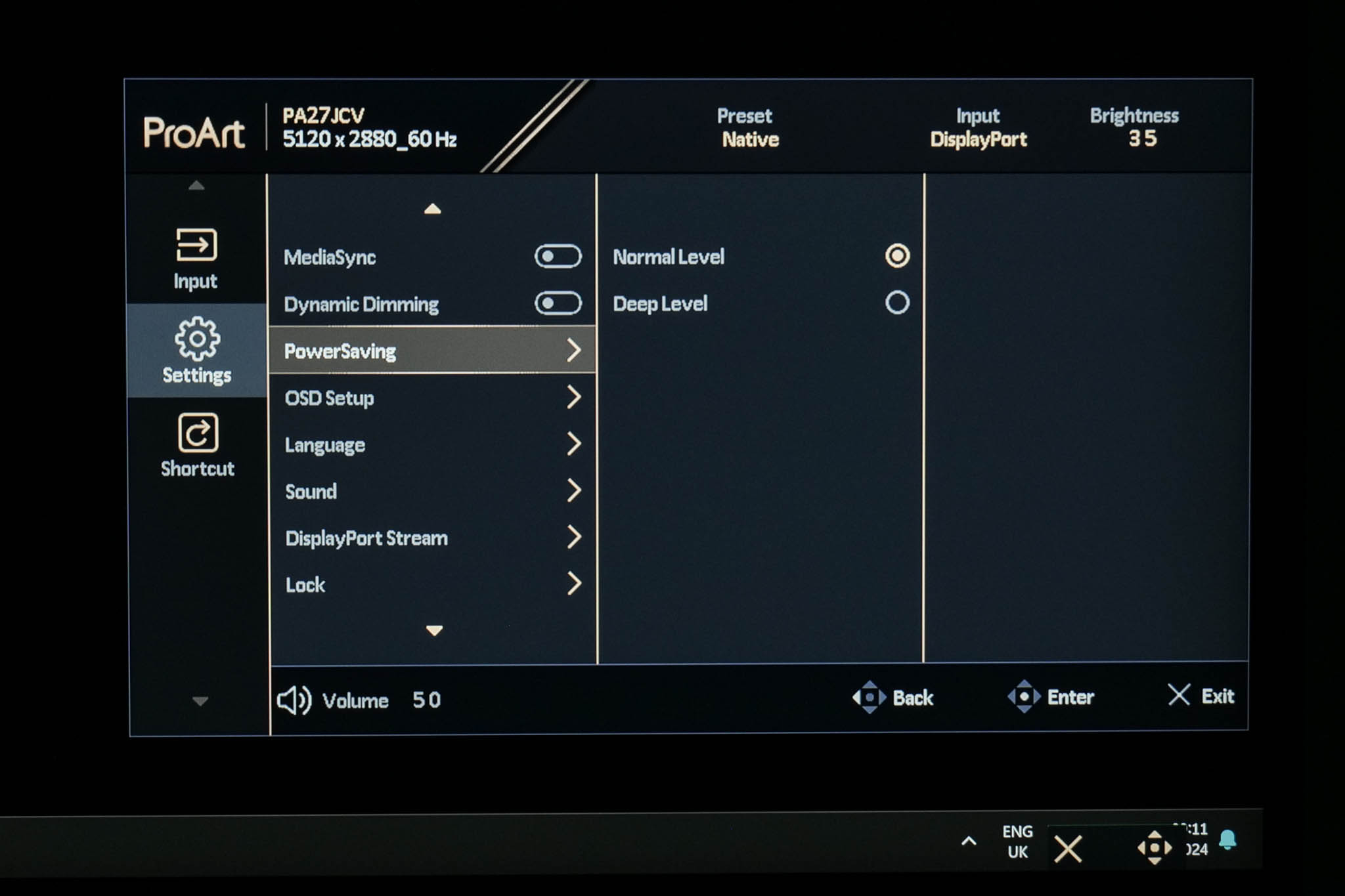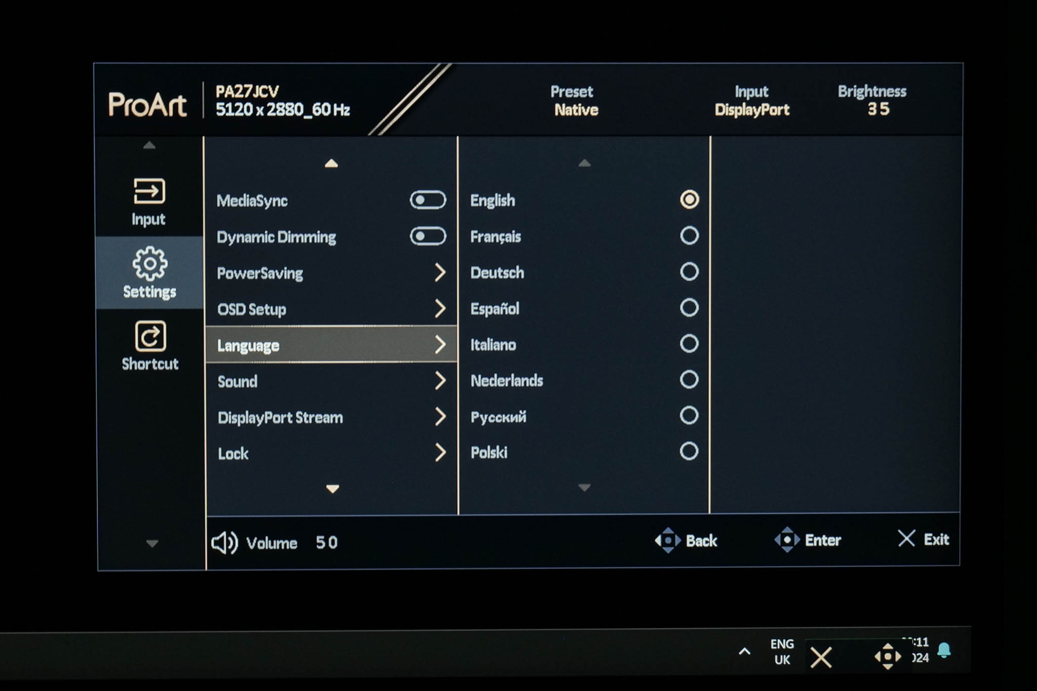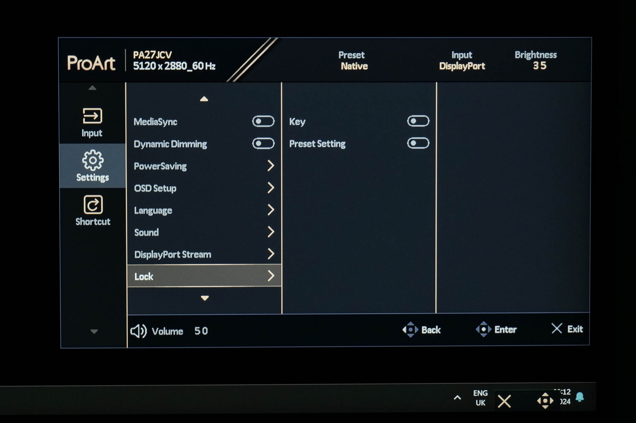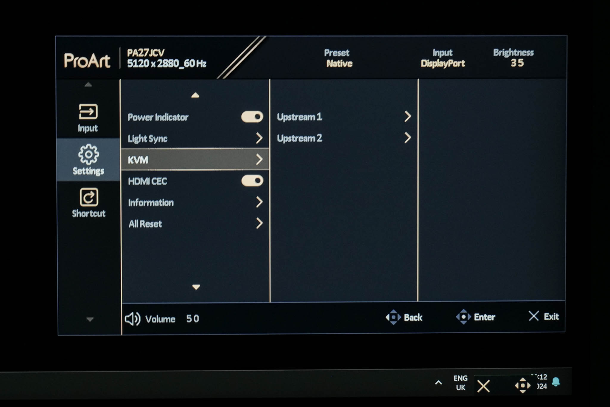 Settings has the most, erm, settings to adjust and it's quite a varied spread. There are basic things like OSD timeout options, but also more advanced features including KVM setup, DisplayPort configuration and ASUS Light Sync, the latter being an interesting feature which leverages ambient light and backlight sensors to automatically fine-tune gamut and white balance (if you want that). You can also get an overview of the monitor's information and firmware version, or reset everything to factory defaults.