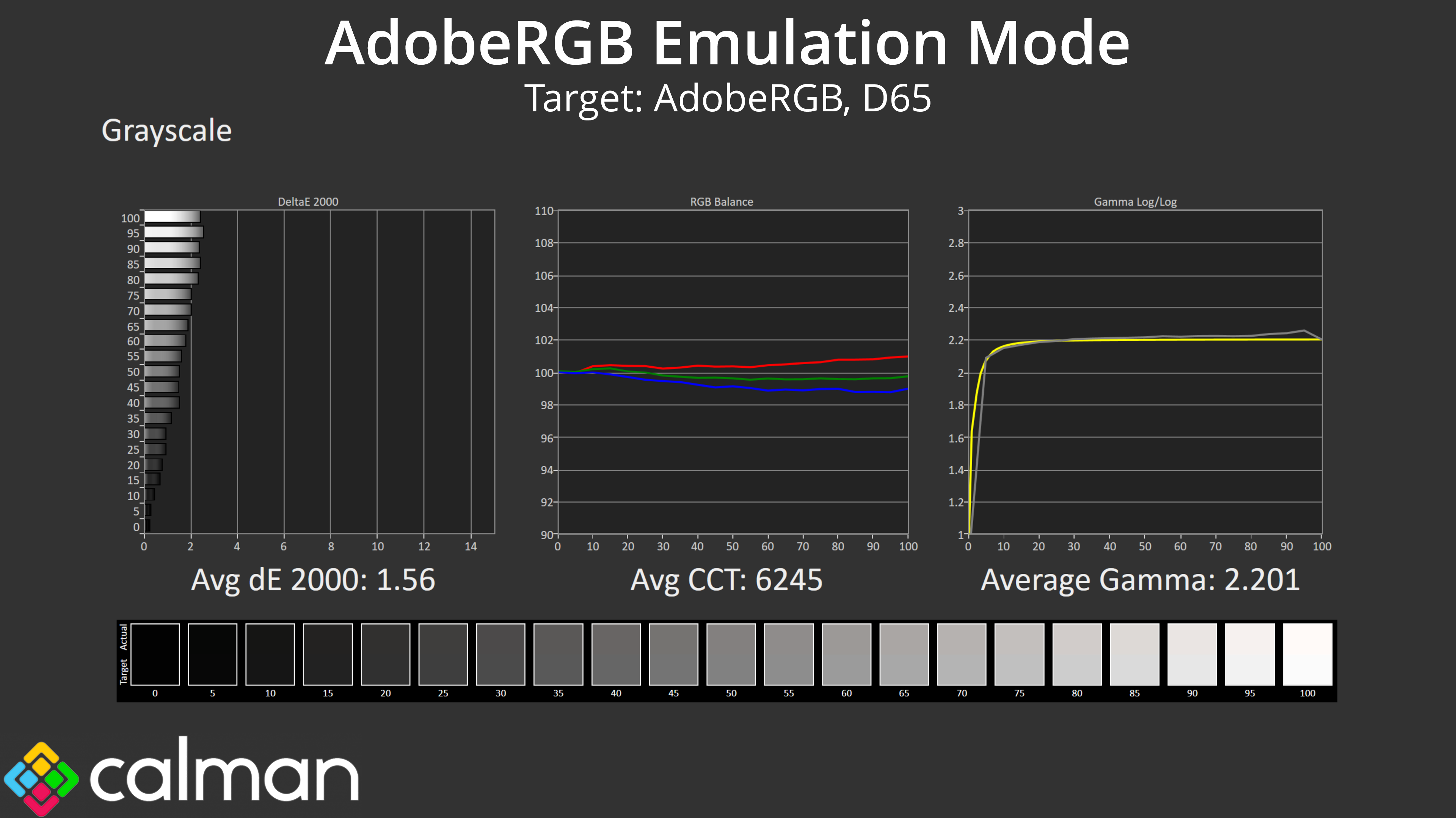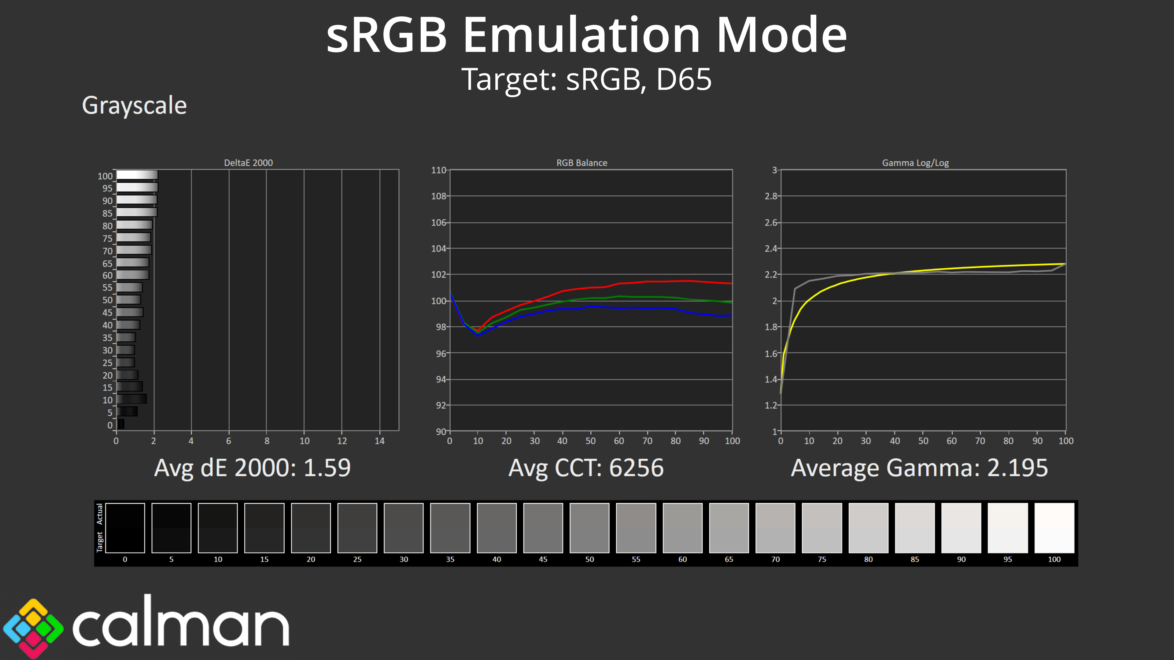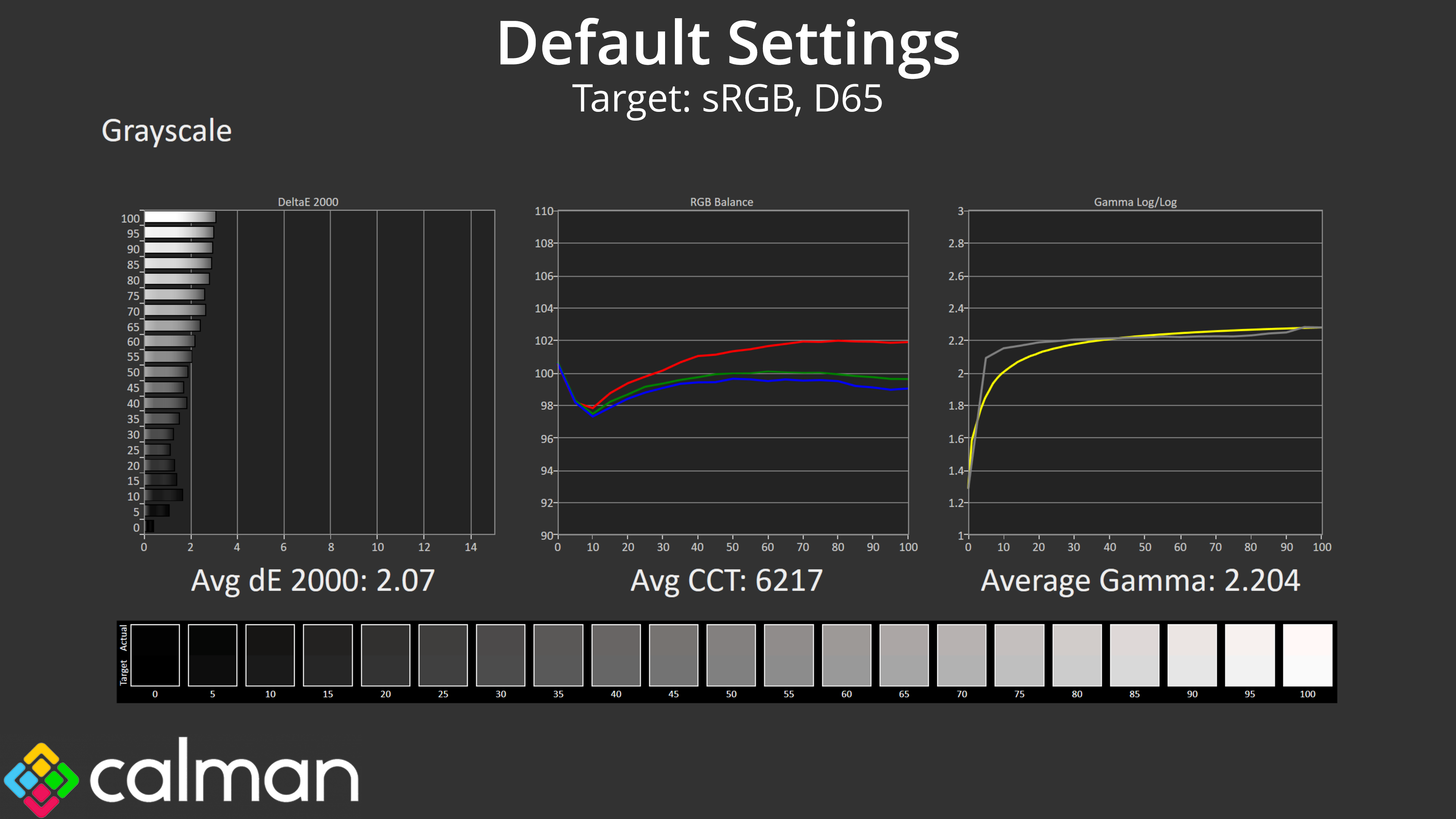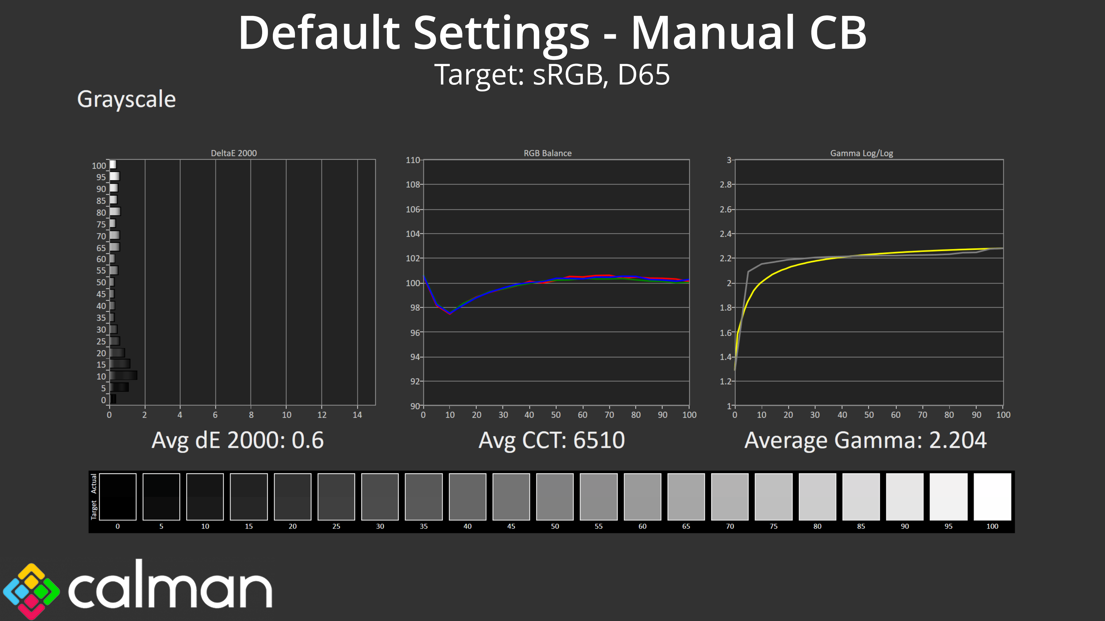 With just one small tweak, I was able to improve the stock results, simply by reducing the Red channel gain from 200 to 190. This improved the average CCT to a near-perfect 6510K, and as a result the average greyscale dE hit just 0.6, a phenomenally good result.
