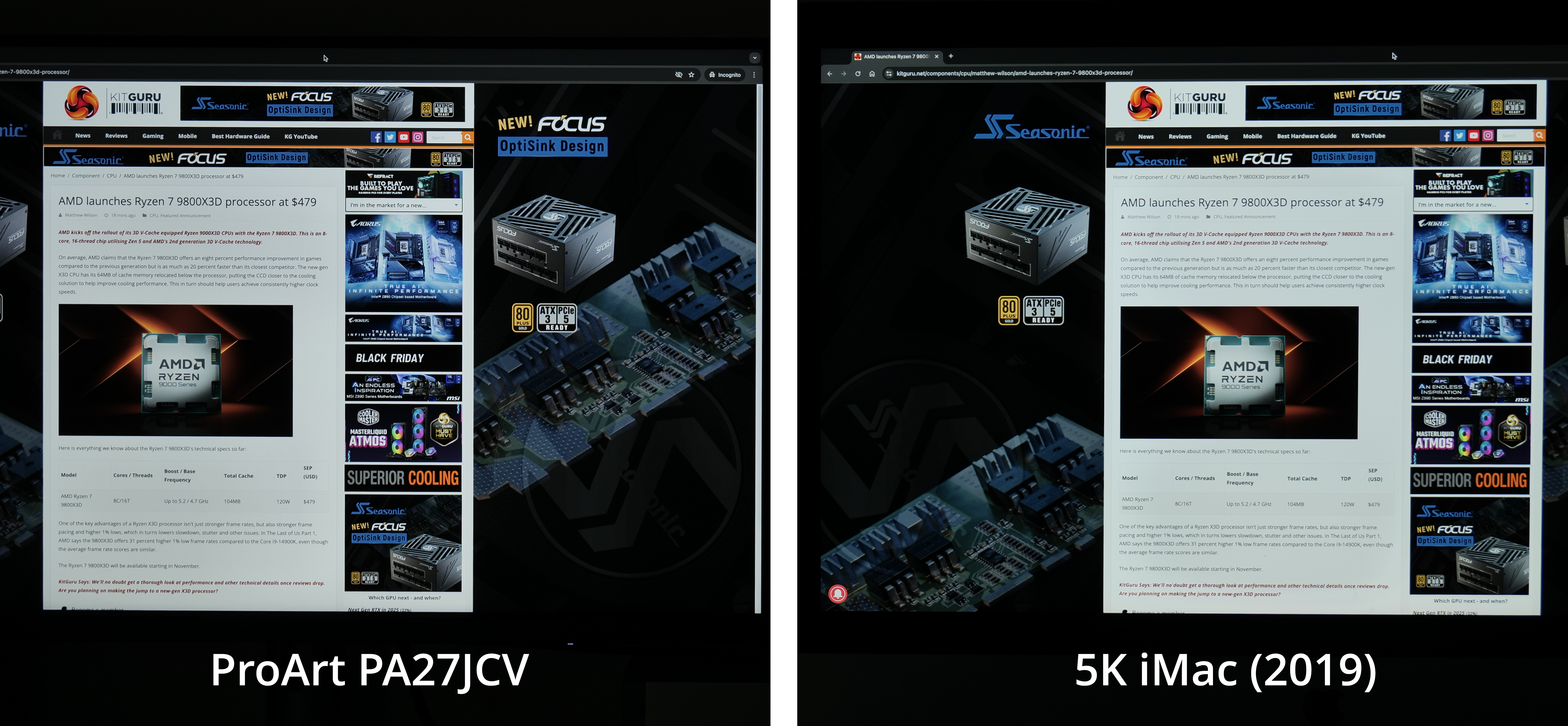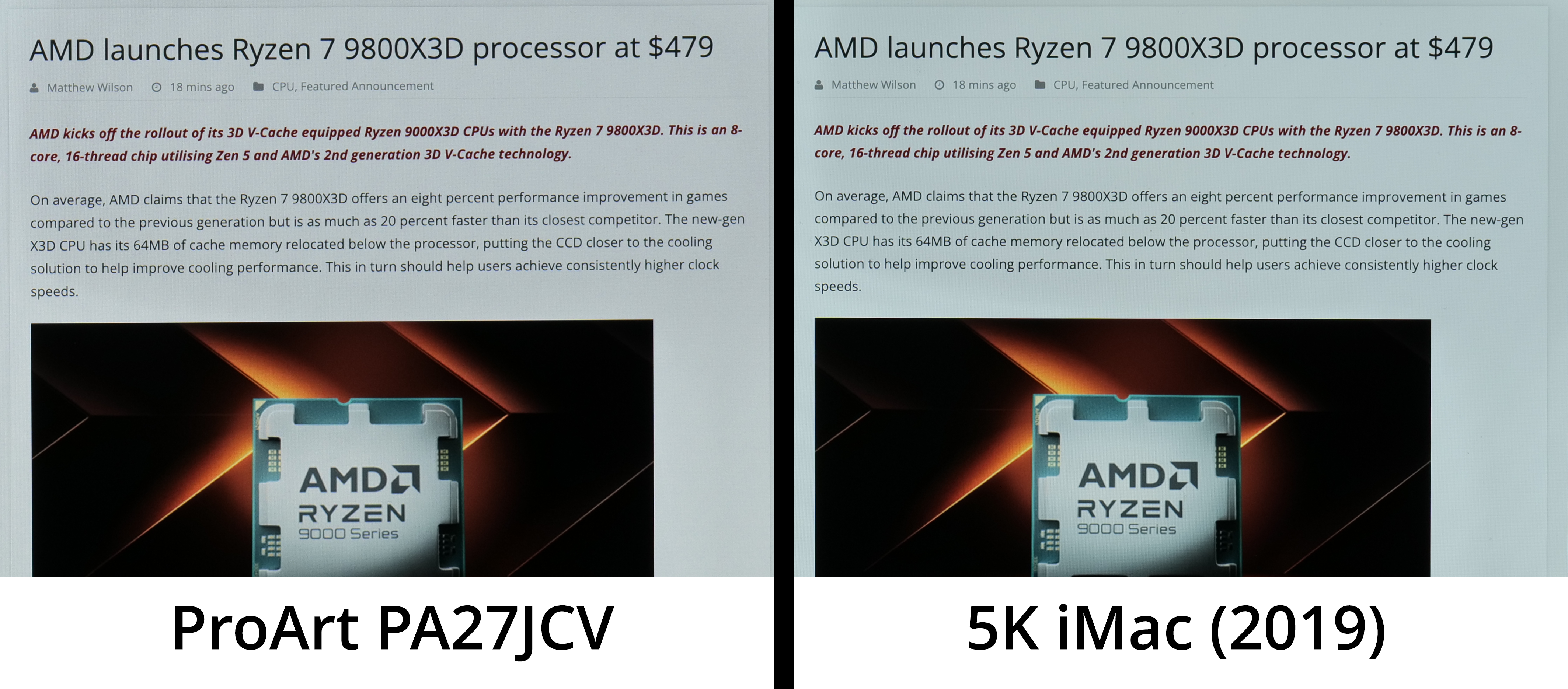 I set the two screens up side by side and connected the ProArt to the iMac via USB-C, so the ProArt was mirroring my iMac display. This means we're not dealing with how different operating systems may handle text or image scaling – it's as close to an apples-to-apples comparison as we could get. I also adjusted both monitors to output at 200 nits – to be specific, the closest I could match them was with the PA27JCV at 203 nits and the iMac at 206.4 nits. Both are running factory settings and colour balance was locked on my camera – the difference in white balance you can see below is just down to the factory calibration.