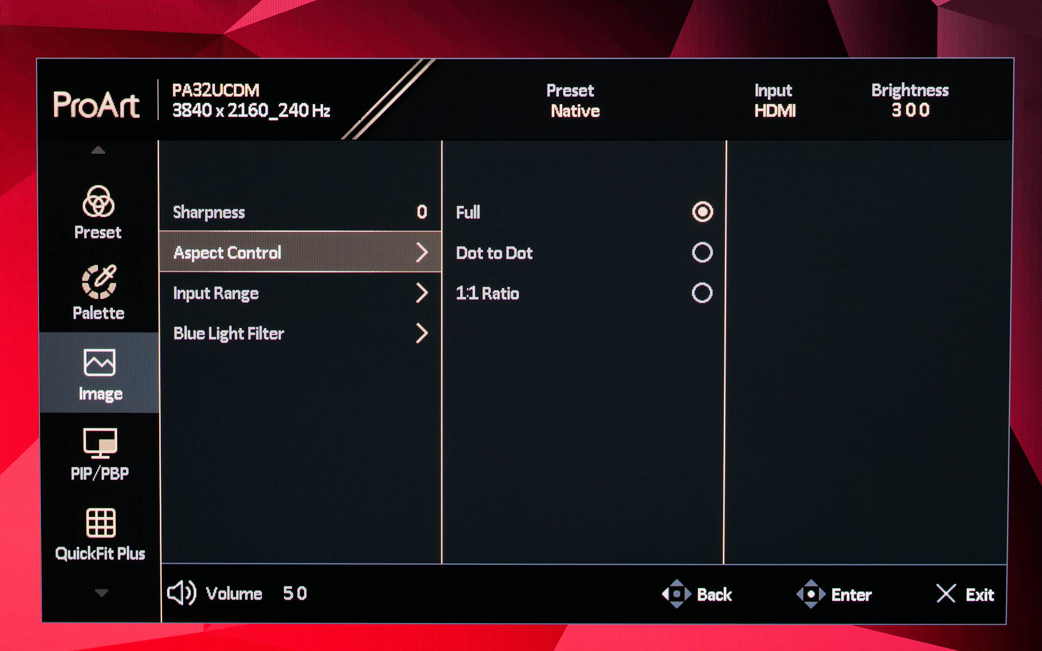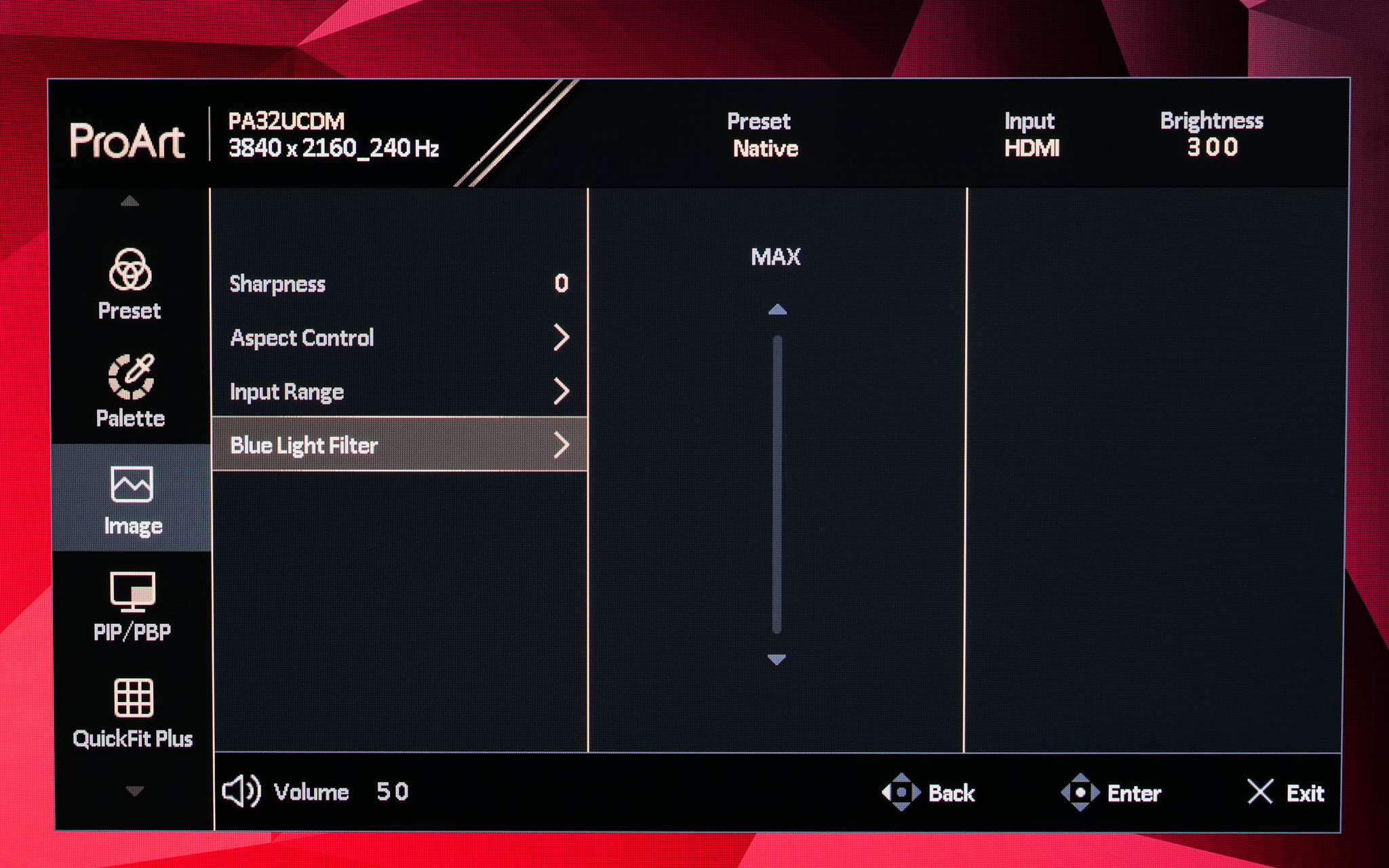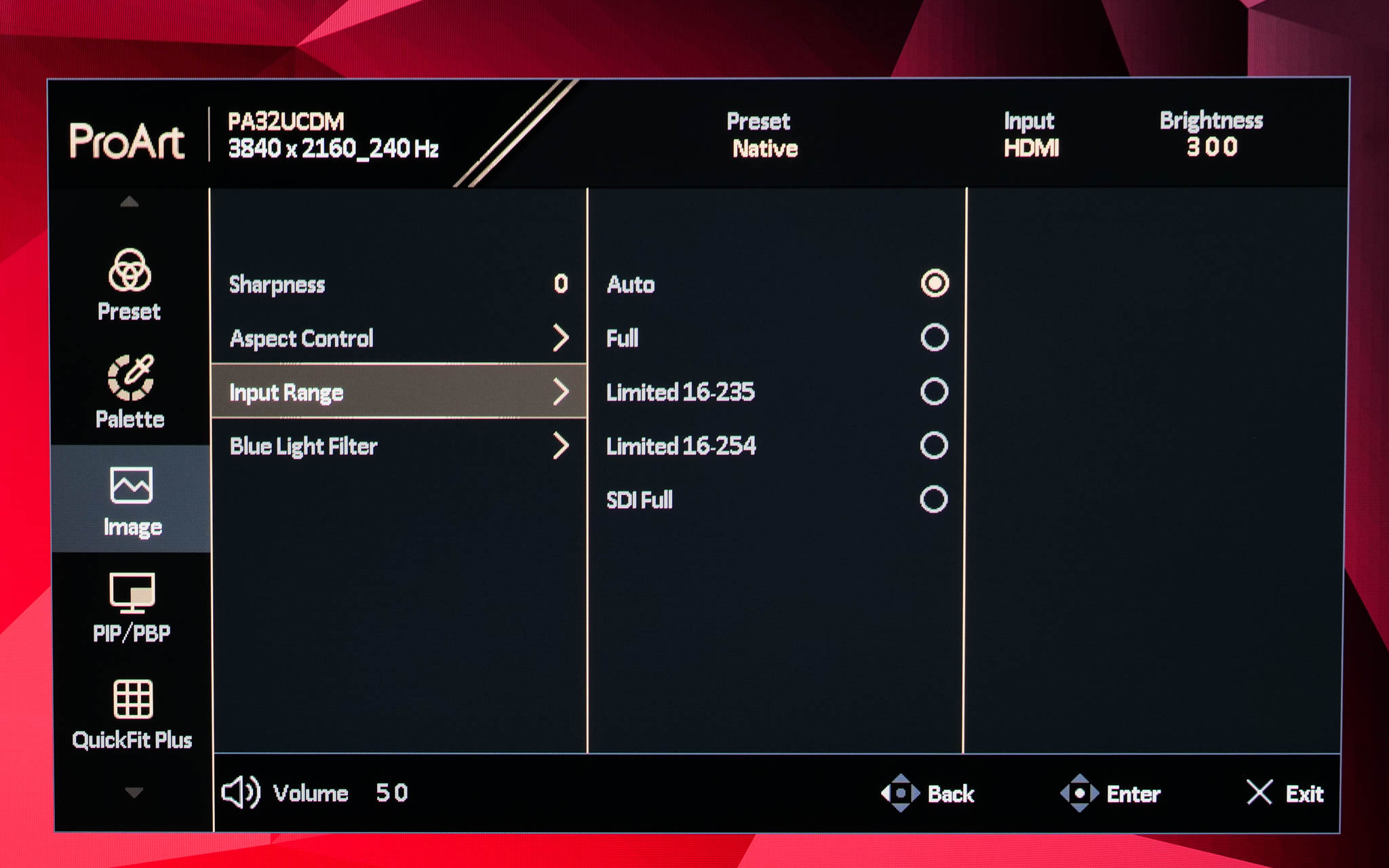 Then there are the Image settings, which includes sharpness, aspect ratio adjustment, input range control, alongside a blue light filter.