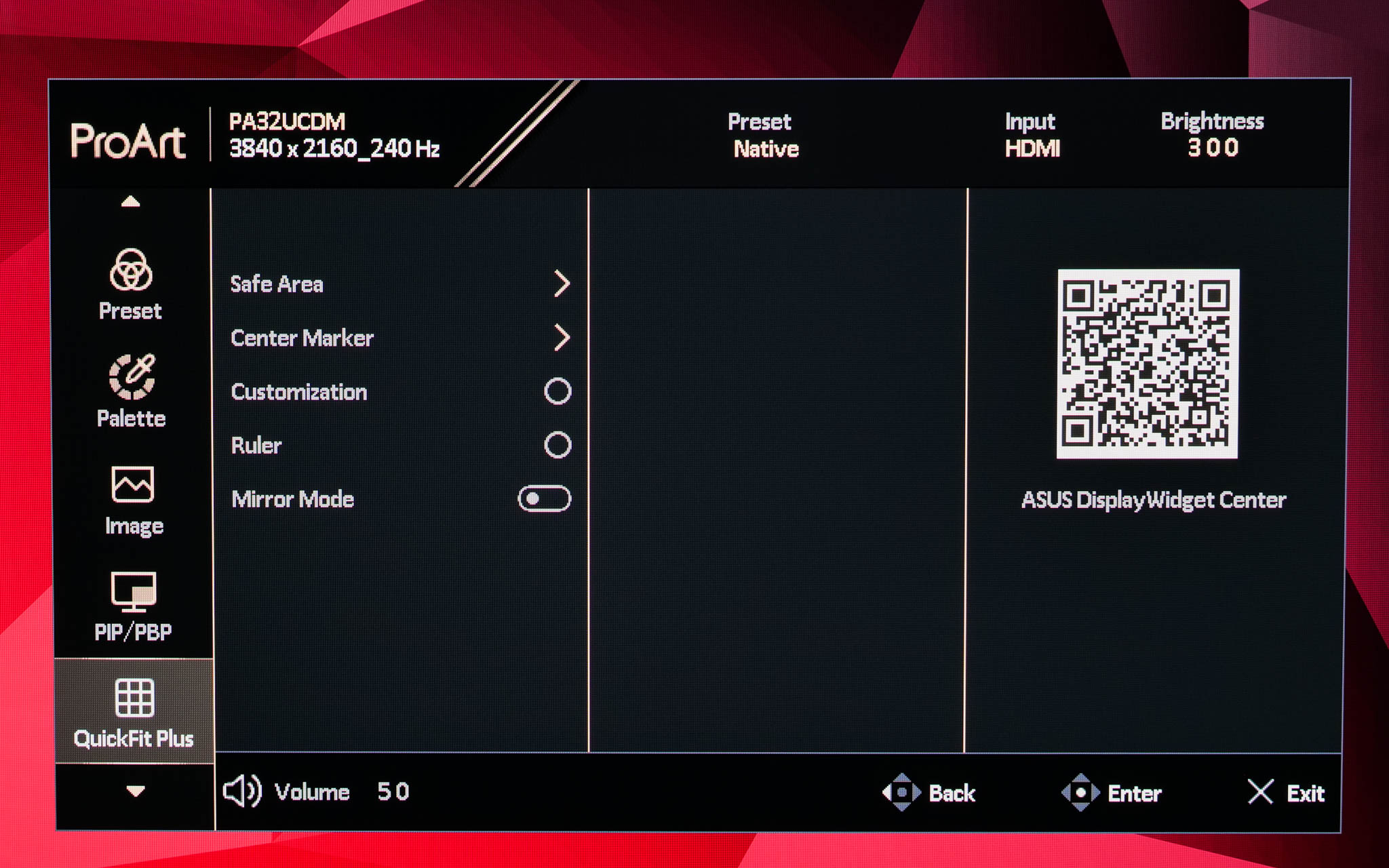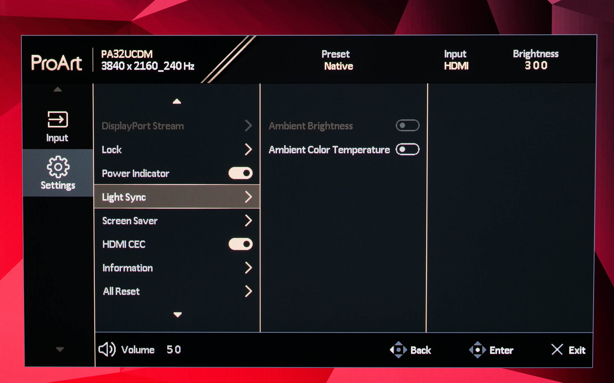 Settings has the most, erm, settings to adjust and it's quite a varied spread. There are basic things like OSD timeout options, but also more advanced features including HDR Preview, which according to ASUS, ‘allows you to preview non-HDR content performance with HDR and HLG mapping'. All of the OLED Care settings can be found here too, along with ASUS Light Sync, an interesting feature which leverages ambient light and backlight sensors to automatically fine-tune gamut and white balance (if you want that). You can also get an overview of the monitor's information and firmware version, or reset everything to factory defaults.