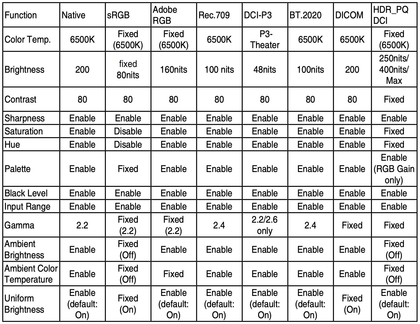Above is a screenshot from the PA32UCDM manual which outlines the exact settings used for each of the colour space modes.