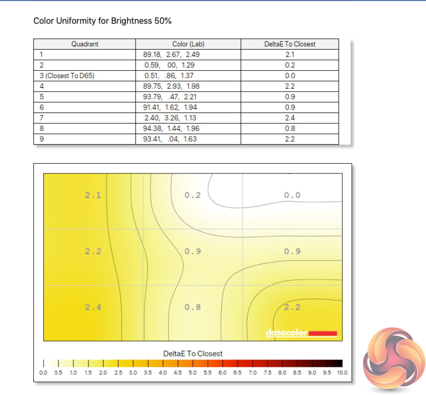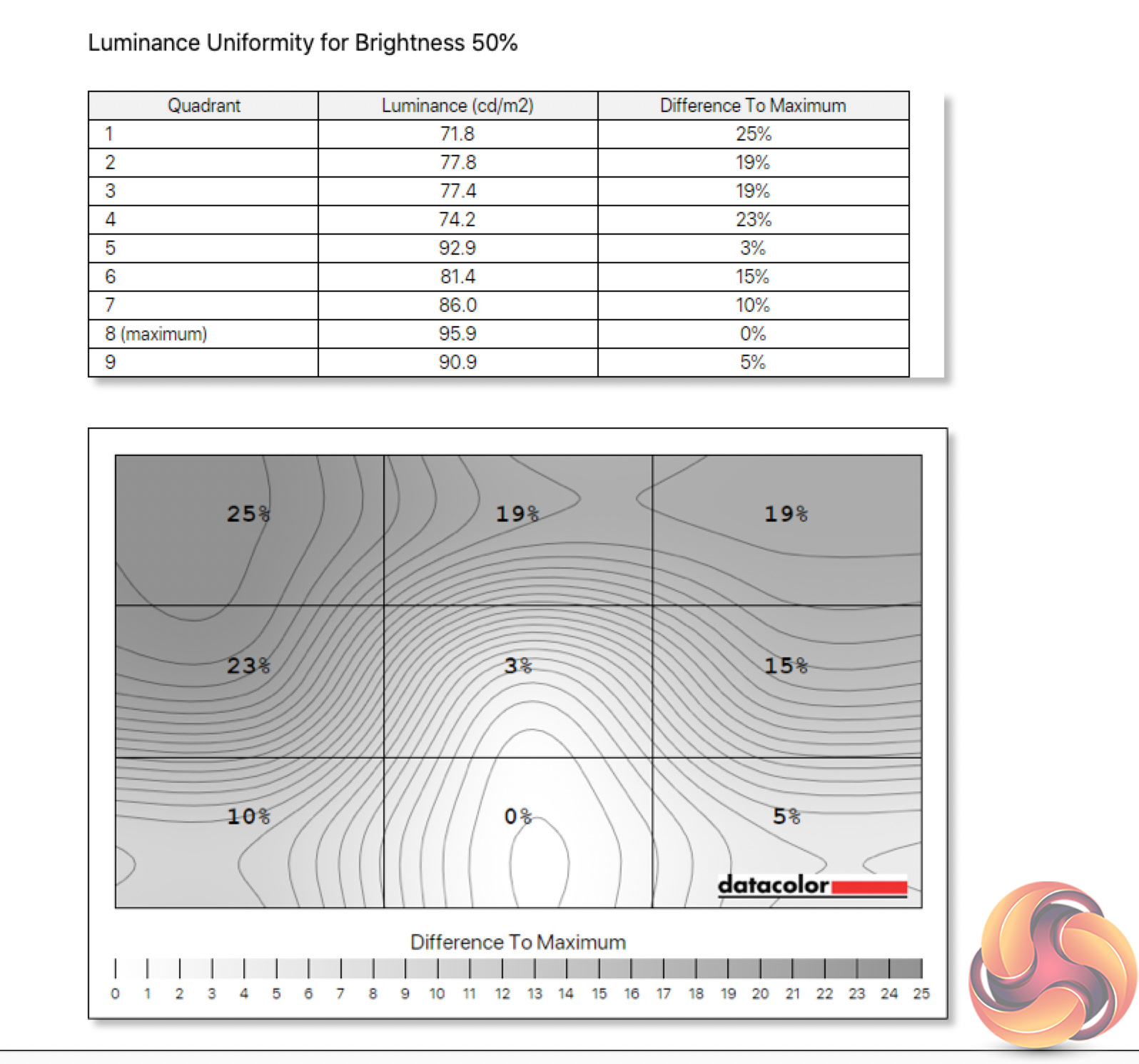 Colour uniformity is a strong area too. We do see some deviation at maximum brightness, but at 75% at below uniformity is excellent across the panel.