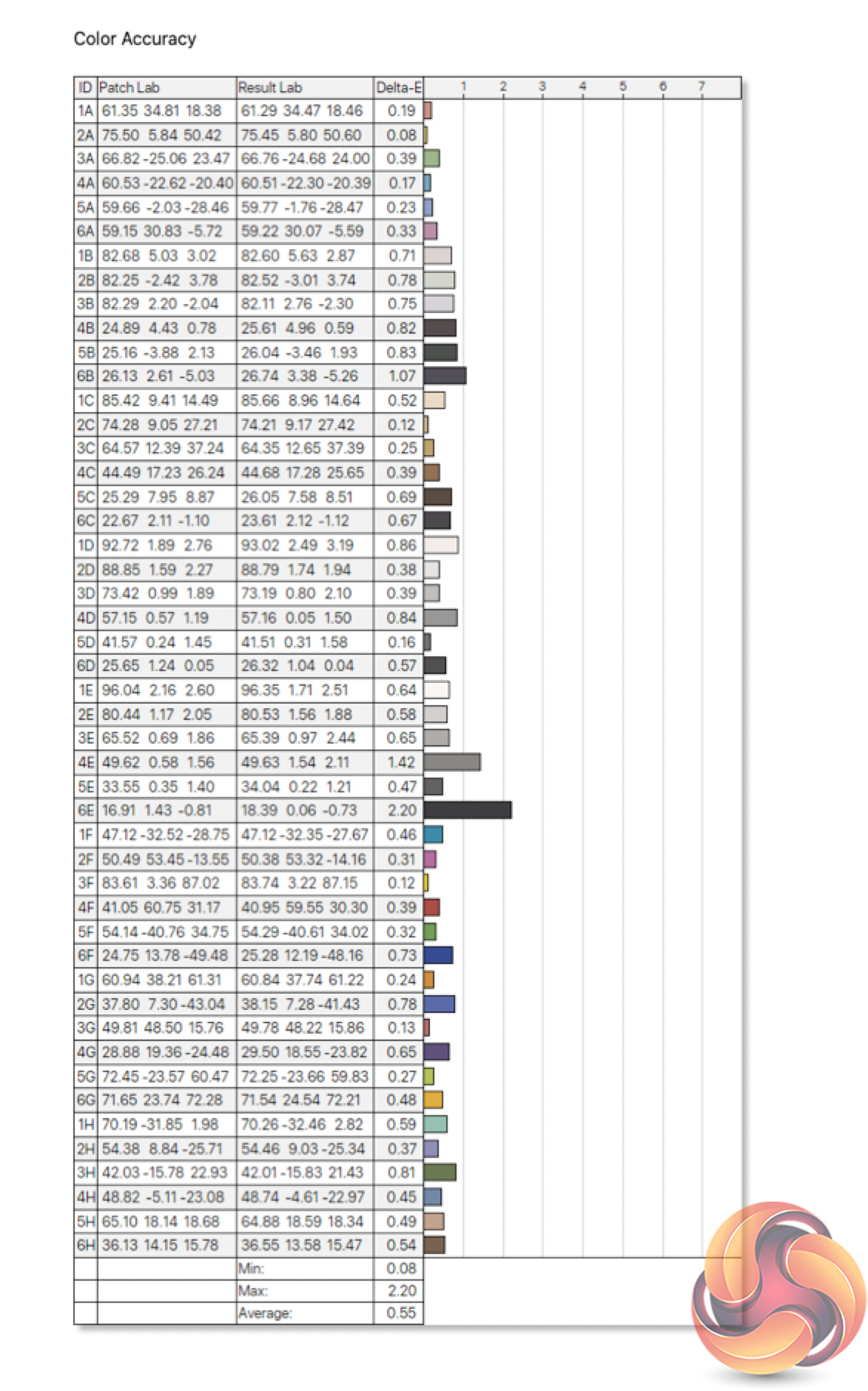 - The colour accuracy, expressed as a Delta E ratio, with a result under 3 being fine for normal use, and under 2 being great for colour-accurate design work.