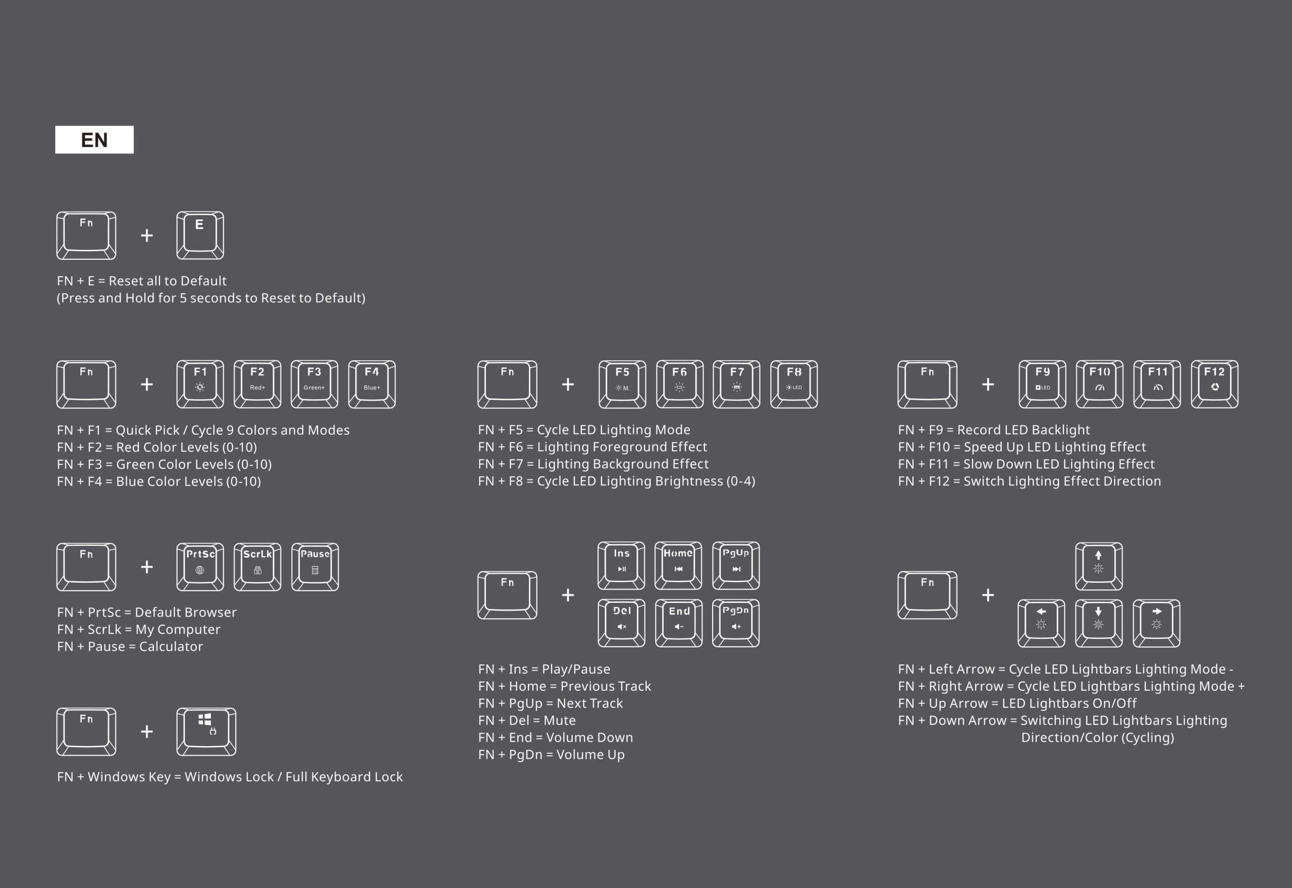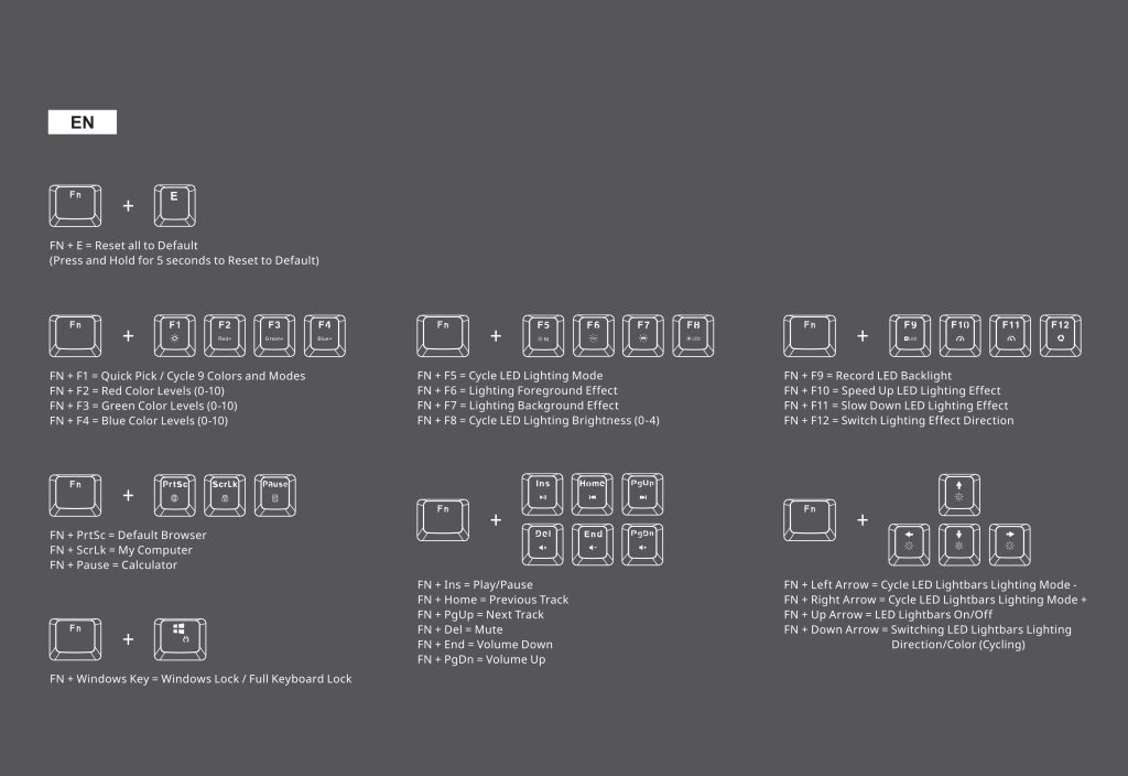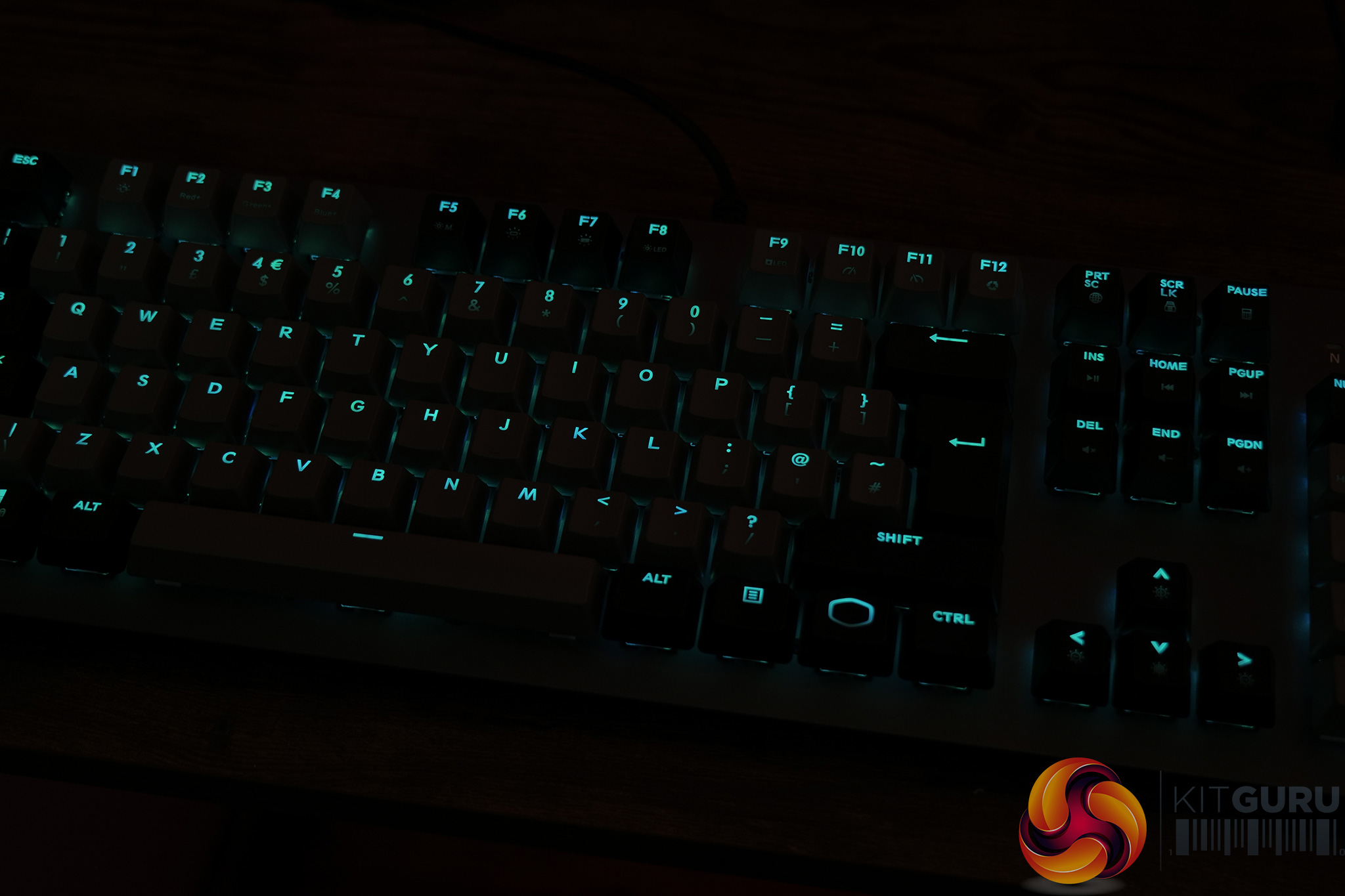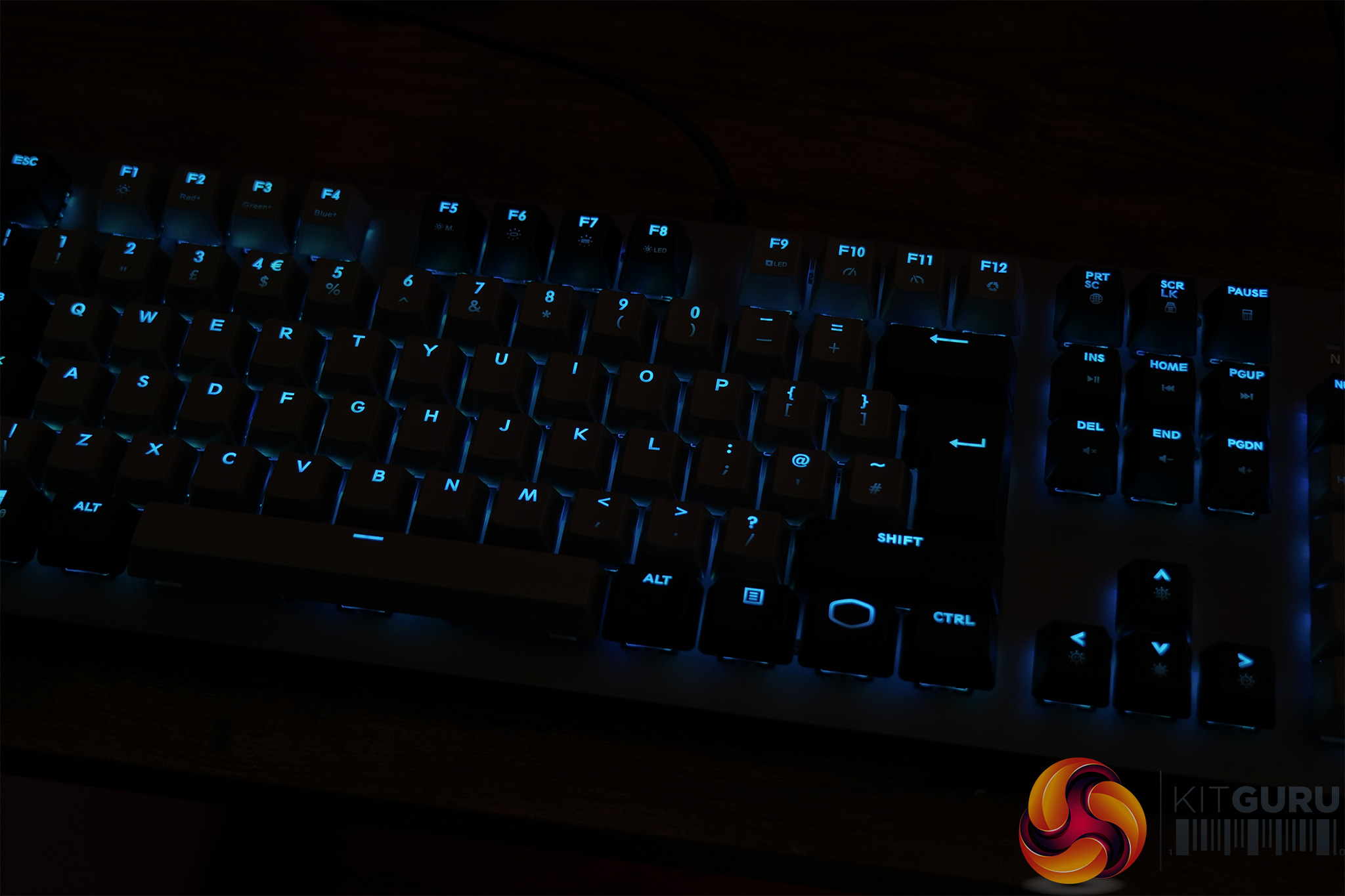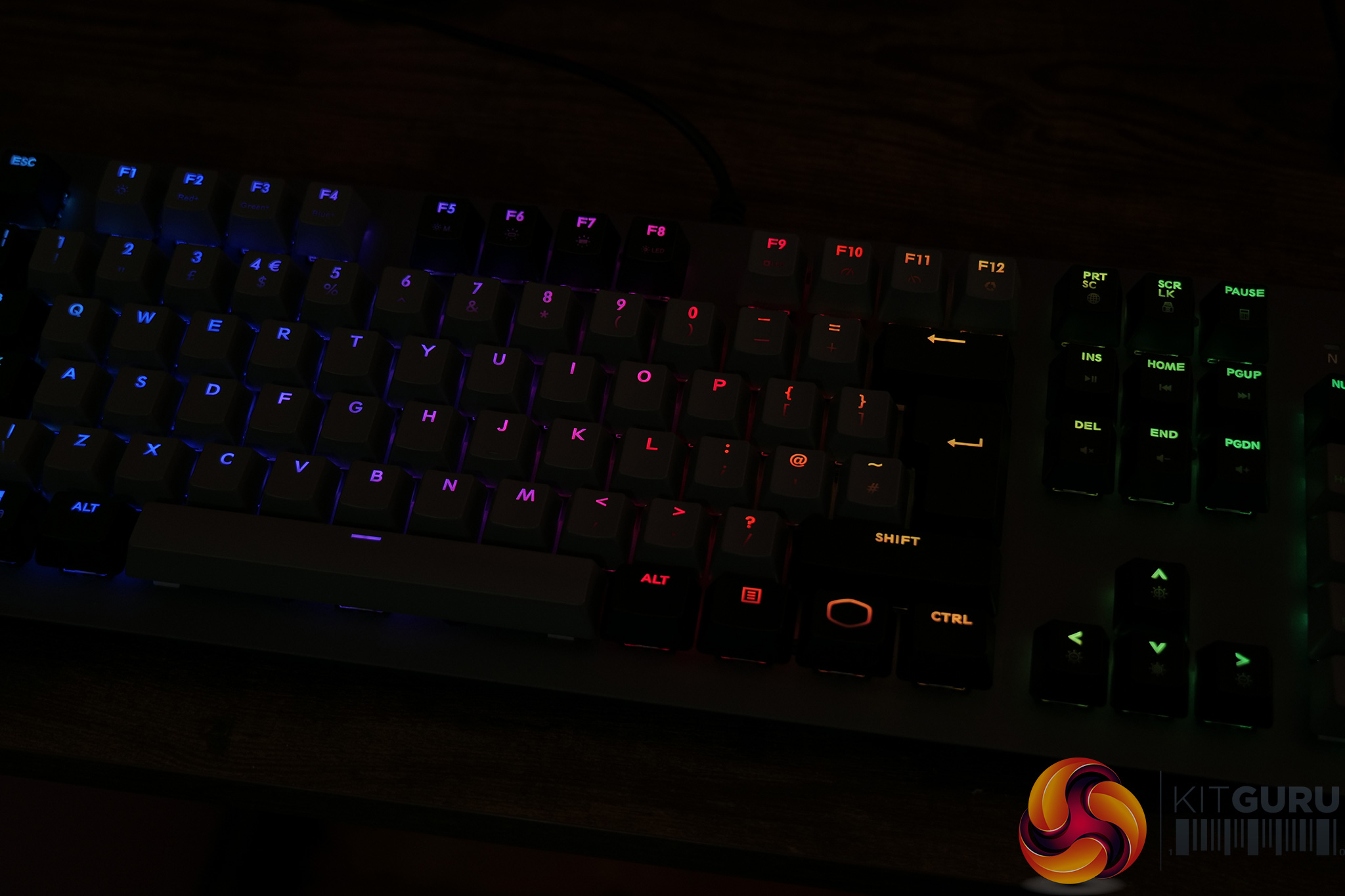 Instead, there is a ton of functionality baked in as secondary functions on the F-keys, arrow keys, and INS/HOME/PGUP keys. Handily, Cooler Master details all of the controls in the quick start guide (as seen above), and it's fairly simple to get your head around these, especially with the secondary functions printed on each keycap.