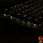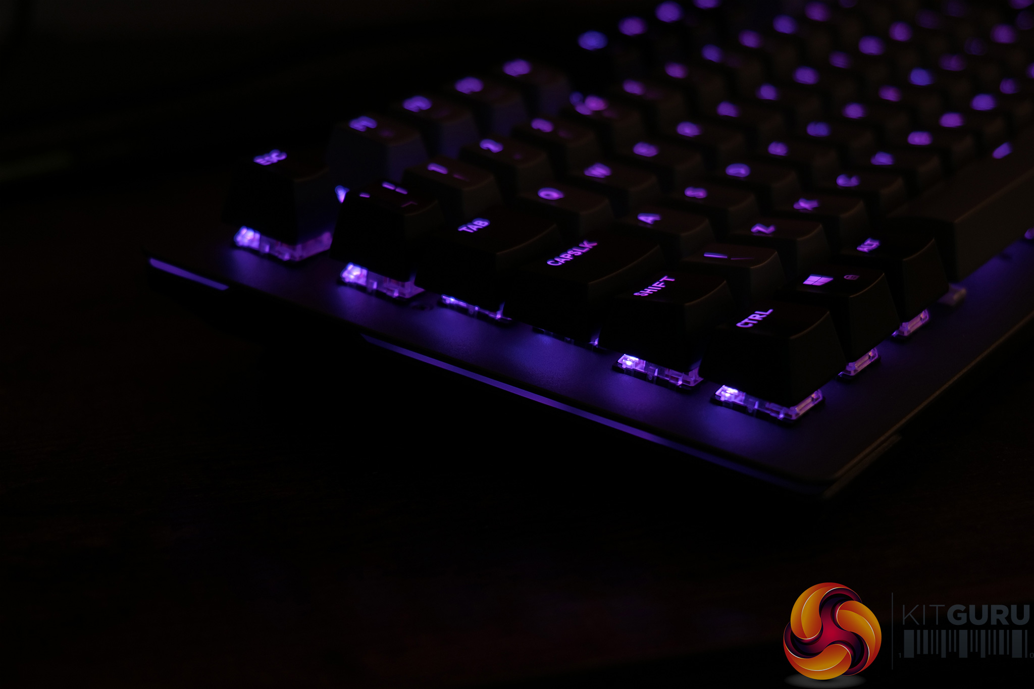 The LEDs themselves get nice and bright, coverage is even across the keycaps and you even get a bit of colour spilling out onto the aluminium top-plate. My one main criticism for the lighting comes down to the LED strips themselves – the lighting is just quite dim and also fairly uneven as it comes out of the diffuser strips themselves. It appears this is because these strips only give off incidental light from the key switches – it doesn't look like there are any dedicated LEDs specifically for these light bars. It's hardly the end of the world, but it does look somewhat sub-par compared to the per-key RGB lighting on the rest of the board.