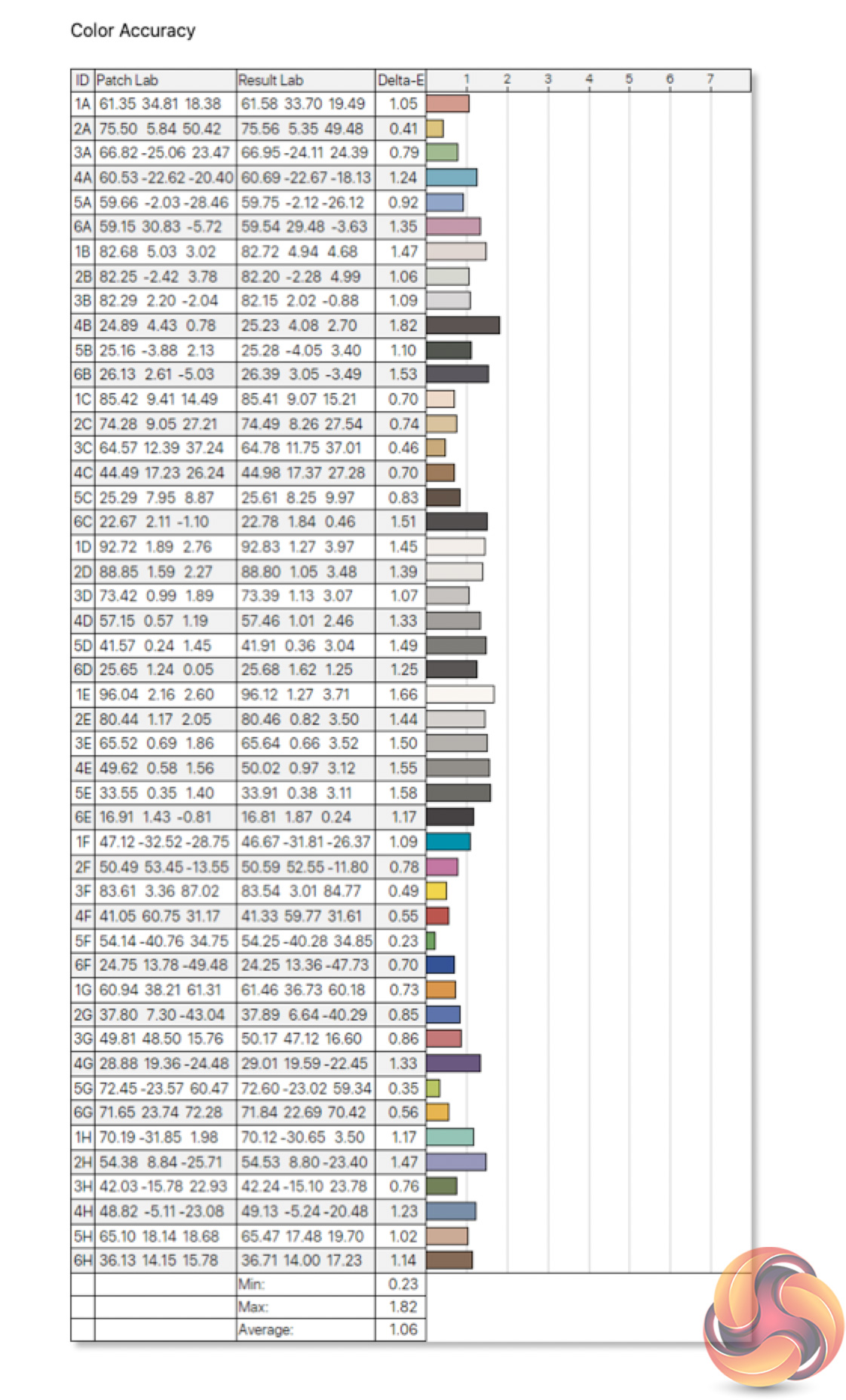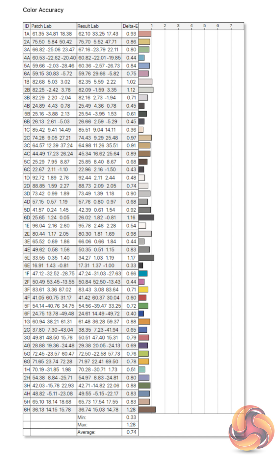 - The colour accuracy, expressed as a Delta E ratio, with a result under 3 being fine for normal use, and under 2 being great for colour-accurate design work.