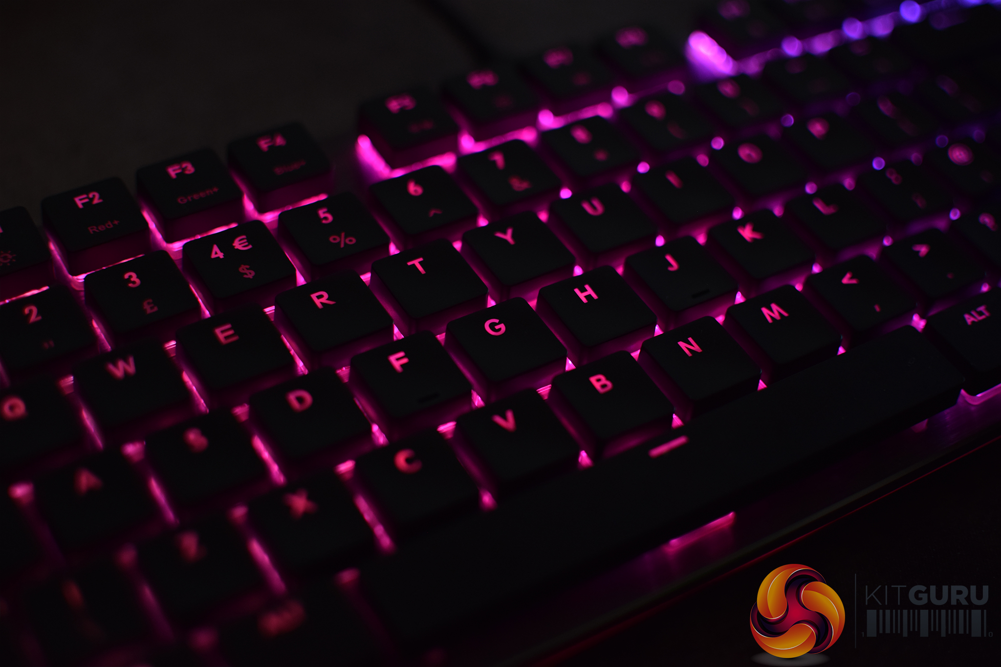Now, as for the lighting, I have to say Cooler Master's per-key implementation looks really good. There's a range of effects to choose from – including rainbow wave, rain, ripple and so on – and overall brightness is good. The LEDs are still positioned at the top of the switches, so the small secondary icons on the functions keys aren't lit too well, but they are still legible.