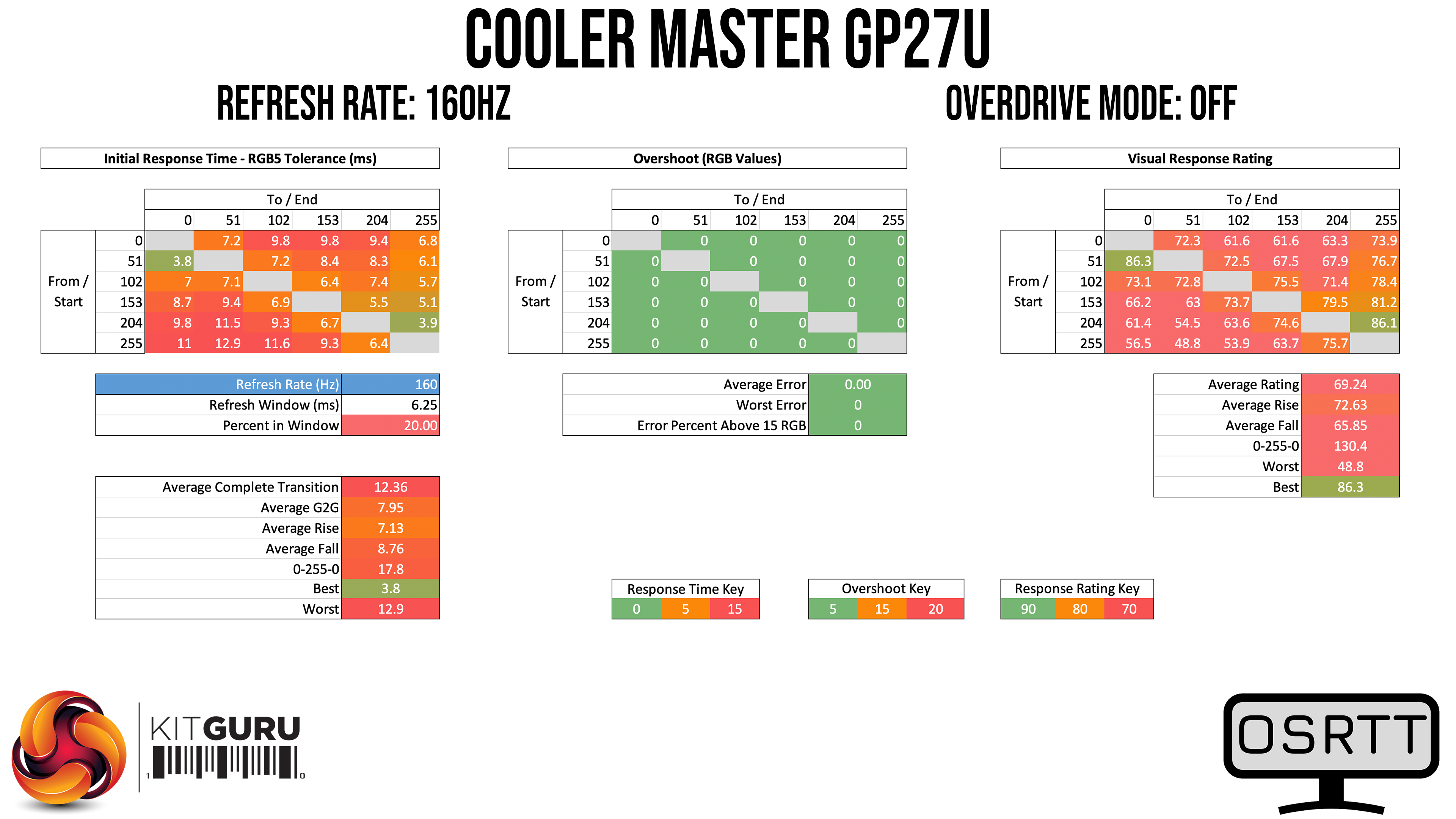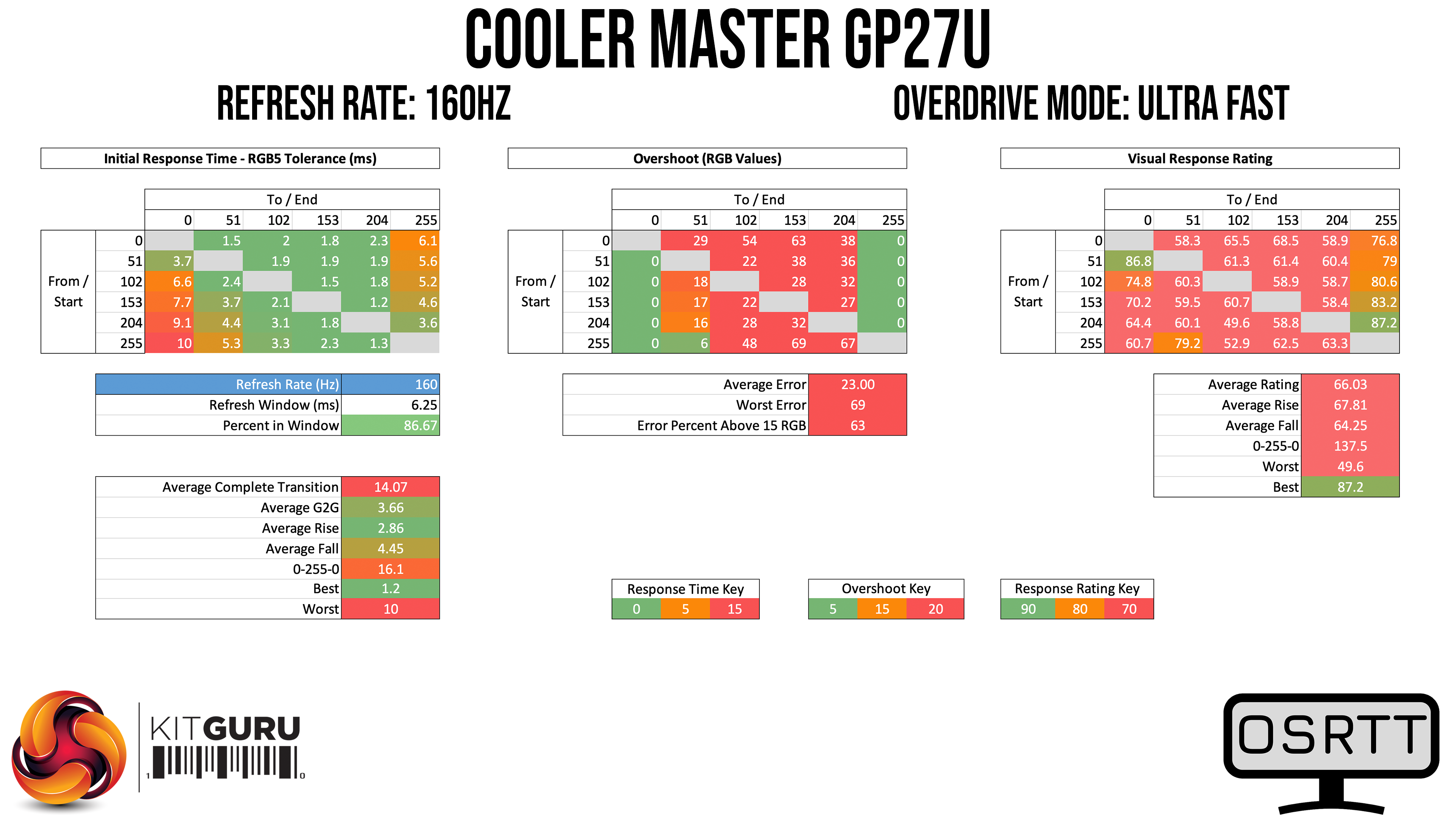 The Advanced mode is the most usable at 160Hz. Here we can see a decent average response time of 5.13ms, despite only a small amount of overshoot. The fall times do seem to be most problematic for the GP27U, particular transitions from RGB 255 (as seen in the bottom left corner) which hurt the average overall, but visually the performance is very acceptable.