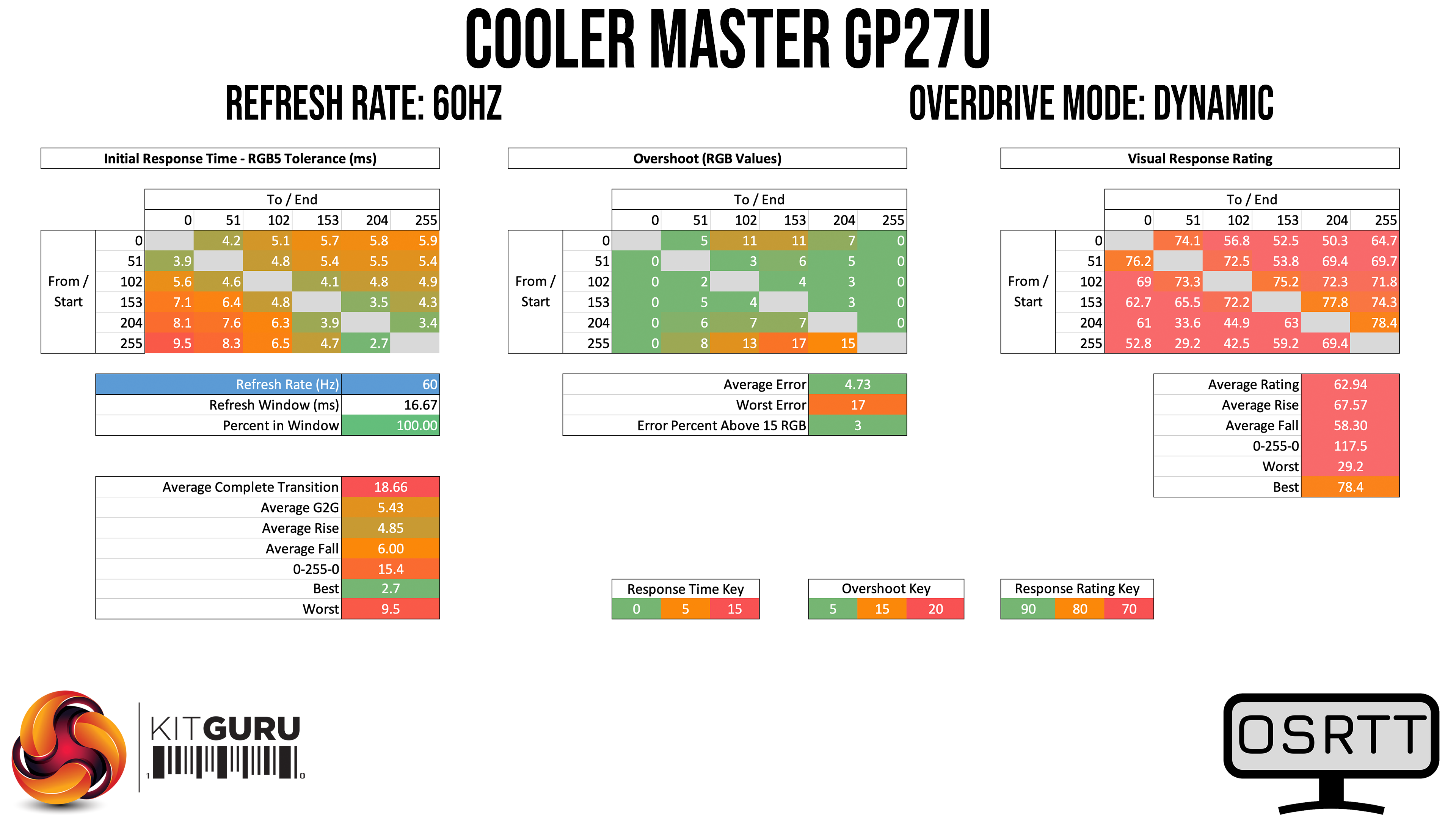 Monitor response time testing is a new addition to our reviews, where we use the Open Source Response Time Tool (OSRTT), developed by TechTeamGB. This measures grey-to-grey response times and presents the results in a series of heatmaps, the style of which you may be familiar with from other reviews.