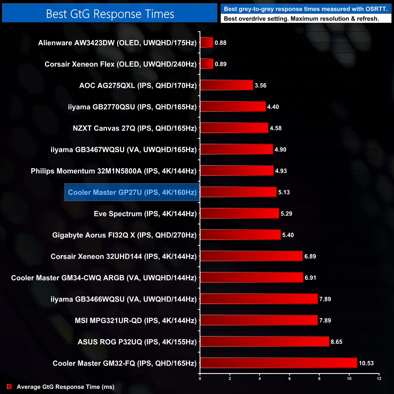 Looking at the average figures taken using a monitor's best overdrive setting at its maximum refresh rate, the GP27U does fairly well. Granted it's not super fast, but a 5ms average is at a similar level the fastest 4K/144Hz screens we've reviewed, while it's noticeably better than some other models, including the ROG PG32UQ and Xeneon 32UHD144.
