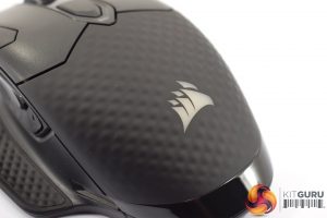 Moving over to the bottom-end of the mouse, the Corsair logo takes pride of place in the middle of the mouse. More interesting, though, is the dimpled plastic that is surrounding the logo – the whole section has this textured feel to it which is quite unique.