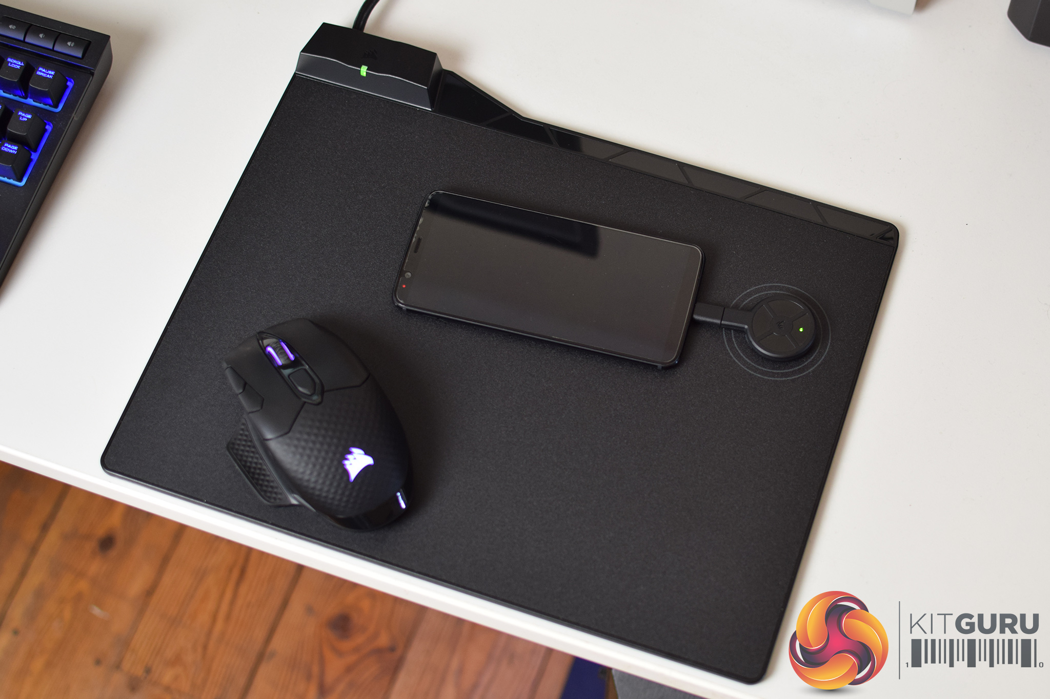 Essentially, the MM1000 is a hard surface mouse mat from Corsair which measures 350mm x 260mm x 5mm. That on its own might not sound too special, but its killer feature is its integrated Qi charging spot, positioned in the top right-hand corner of the mat.