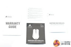 That means the Harpoon RGB Wireless is a small to medium sized mouse – the measurements are 115.5(L) x 68.3(W) x 40.4(H) mm – and it is an ergonomic shape for right handers. The main body of the mouse is made from a slightly textured plastic, with the Corsair logo at the bottom being the sole RGB lighting zone.