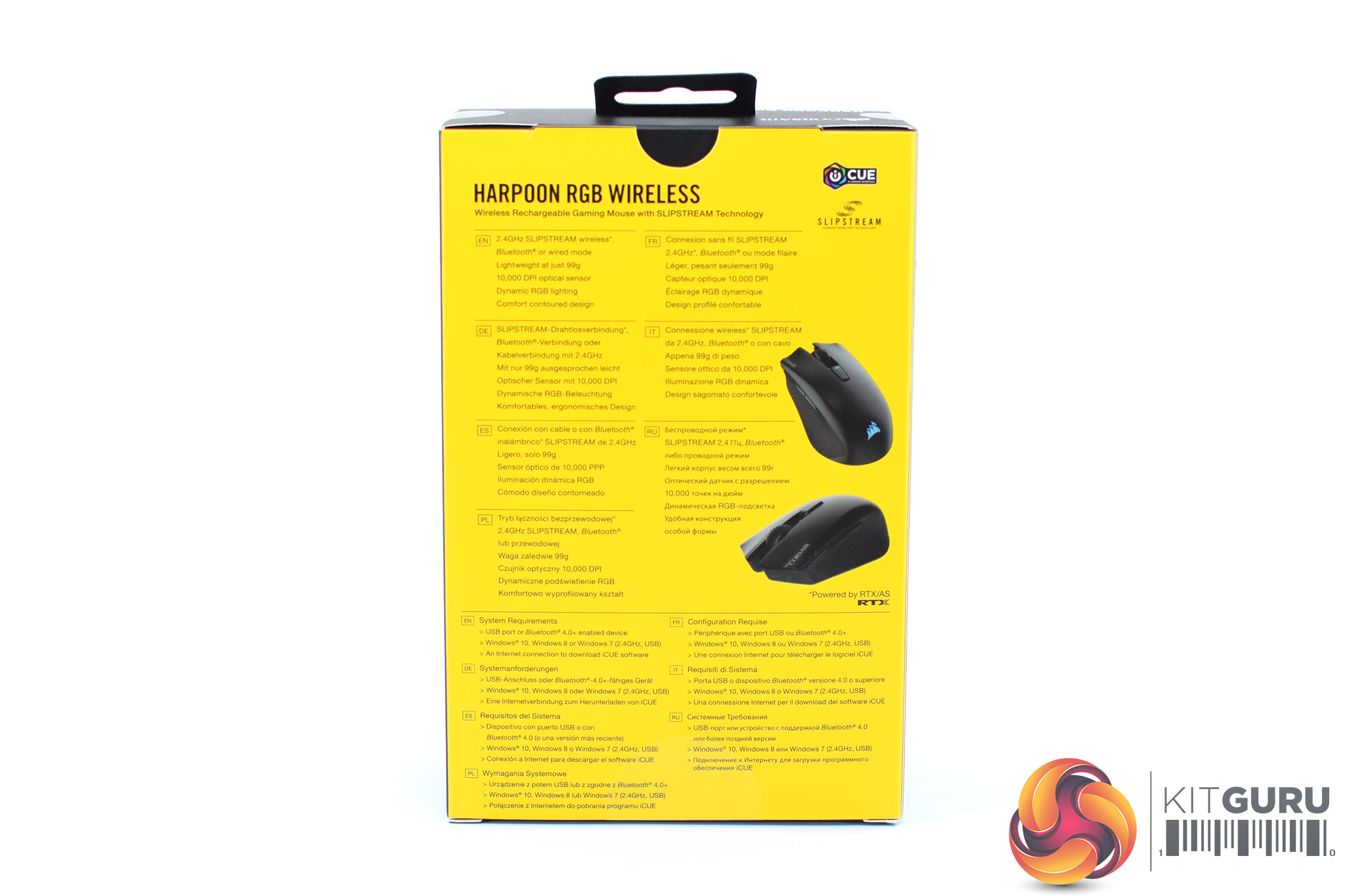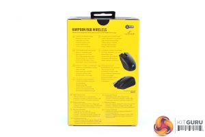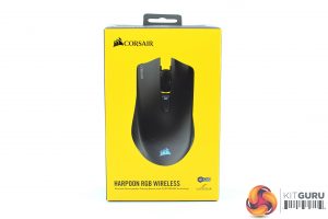 The Corsair Harpoon RGB Wireless ships in a yellow box – Corsair's signature style. A large image of the mouse itself is placed front and centre.