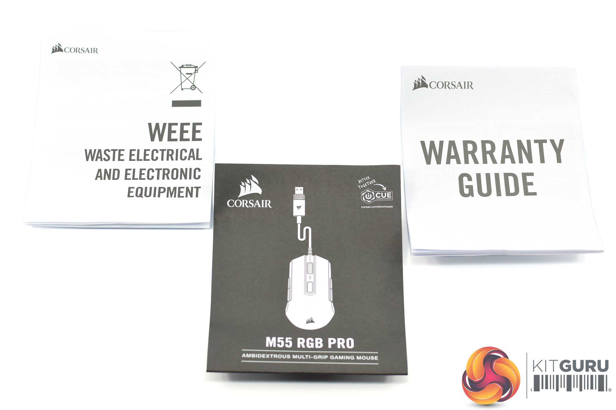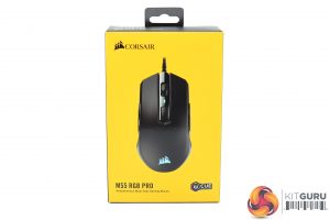 The M55 RGB Pro ships in a familiar-looking box – it uses Corsair's signature yellow colouring, with an image of the mouse taking up most of the front.