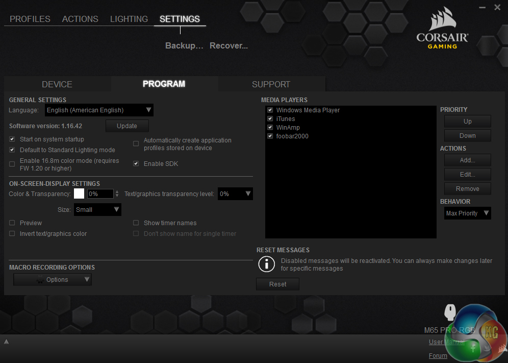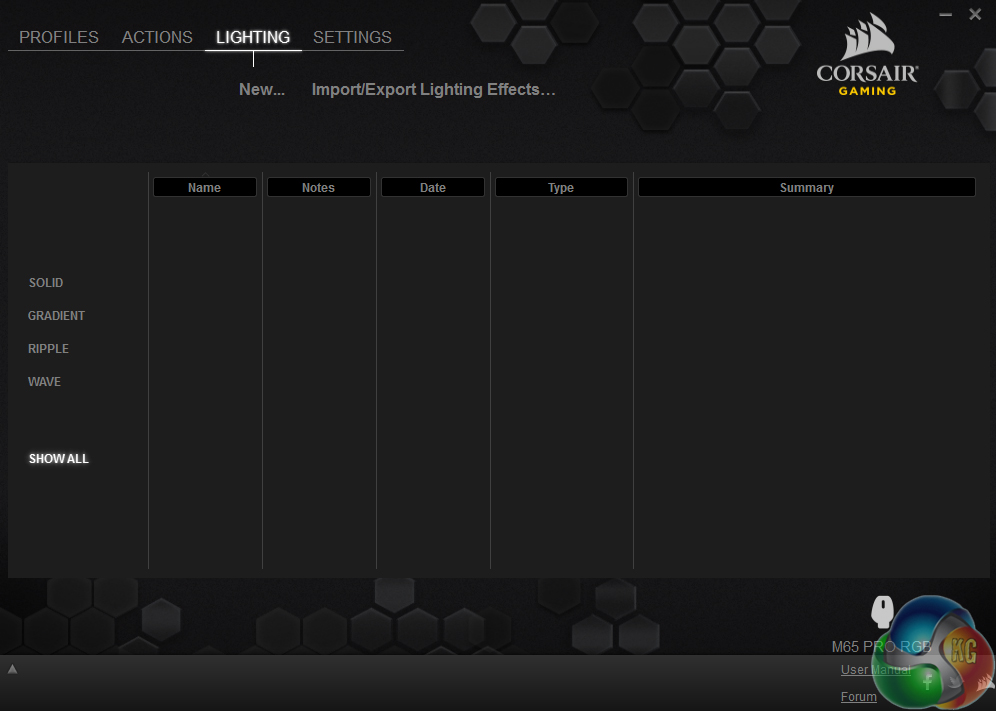 The same can be said of the lighting tab. Rather than setting the colours used for the backlight, the lighting tab allows users to create different effects for the M65 Pro's backlight. While I prefer a solid backlight, there is the option to create gradient, ripple and wave effects – as well as change the lighting intensity.
