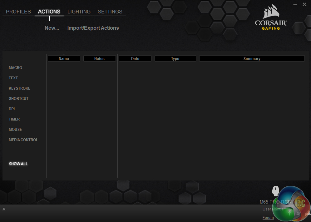 On to the actions tab. This allows users to record macros, as well as set shortcuts and trigger actions via a keystroke – to name but 3 options available. There is huge scope to get creative here, with a wealth of options to keep even the most picky of users happy. Though I do not personally make use of such features, the option is there for people who do.