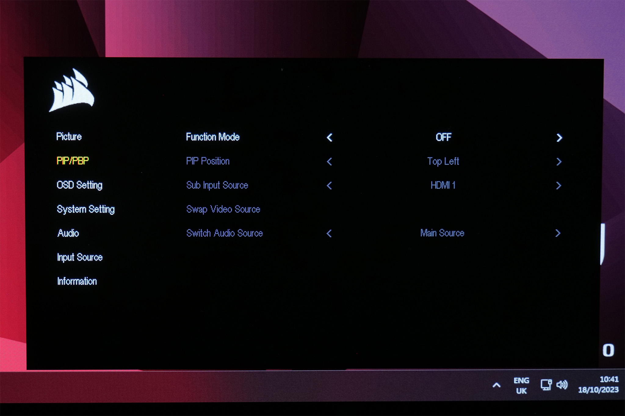 The OSD is split into seven main tabs – Picture, PIP/PBP, OSD Setting, System Setting, Audio, Input Source, Information: