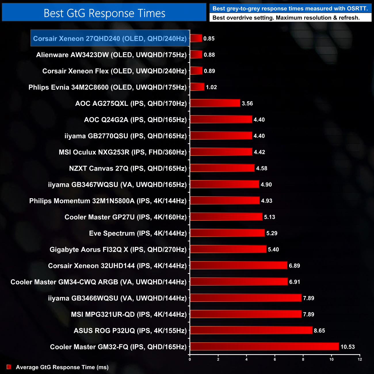 Putting those results into context, the 27QHD240 sits right at the top of our response time chart, grouped closely with the other OLED monitors we've tested. The next-best LCD is over three times slower, which goes to show the inherent advantage OLED screen can offer in the gaming market.