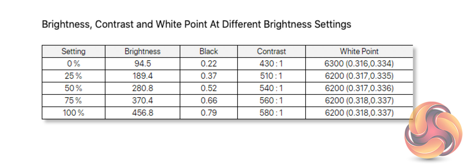Brightness levels are very solid too. We see a peak reading of 466.6 nits which should be enough for almost everybody – I typically used the screen at 60% brightness. Contrast isn't great however, with a peak of just 630:1, something we also observed with the 32QHD165. I have seen reports that the SpyderX unit can under-report contrast, but for an IPS panel this was never going to be a particular high-point. We can also note a slightly warm white-point at 6100K – it's not miles off the 6500K ideal though.