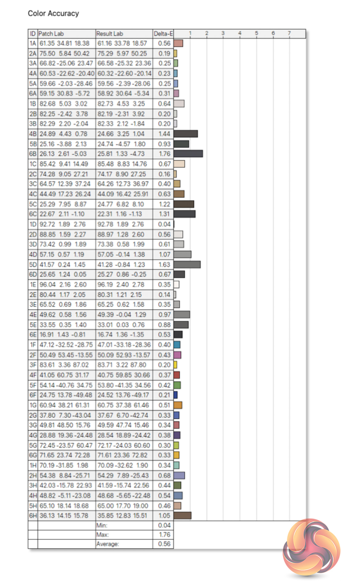 - The colour accuracy, expressed as a Delta E ratio, with a result under 3 being fine for normal use, and under 2 being great for colour-accurate design work.
