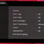 The menu system is broken down into eight tabs, as seen below. These are: Game, Brightness/Contrast, Input Source, AlienFX Lighting, Audio, Menu, Personalize, Others.