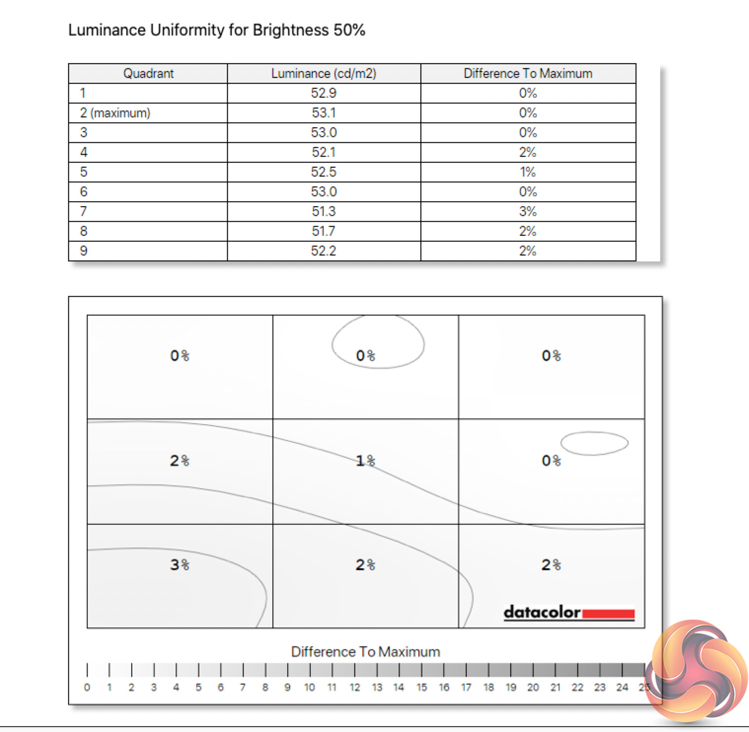 Similarly, luminance uniformity is exceptional. At most we see just 3% deviation, indicating incredible evenness of lighting across the panel – one of the clear benefits of OLED, as there's no backlight that needs to evenly illuminate the panel.