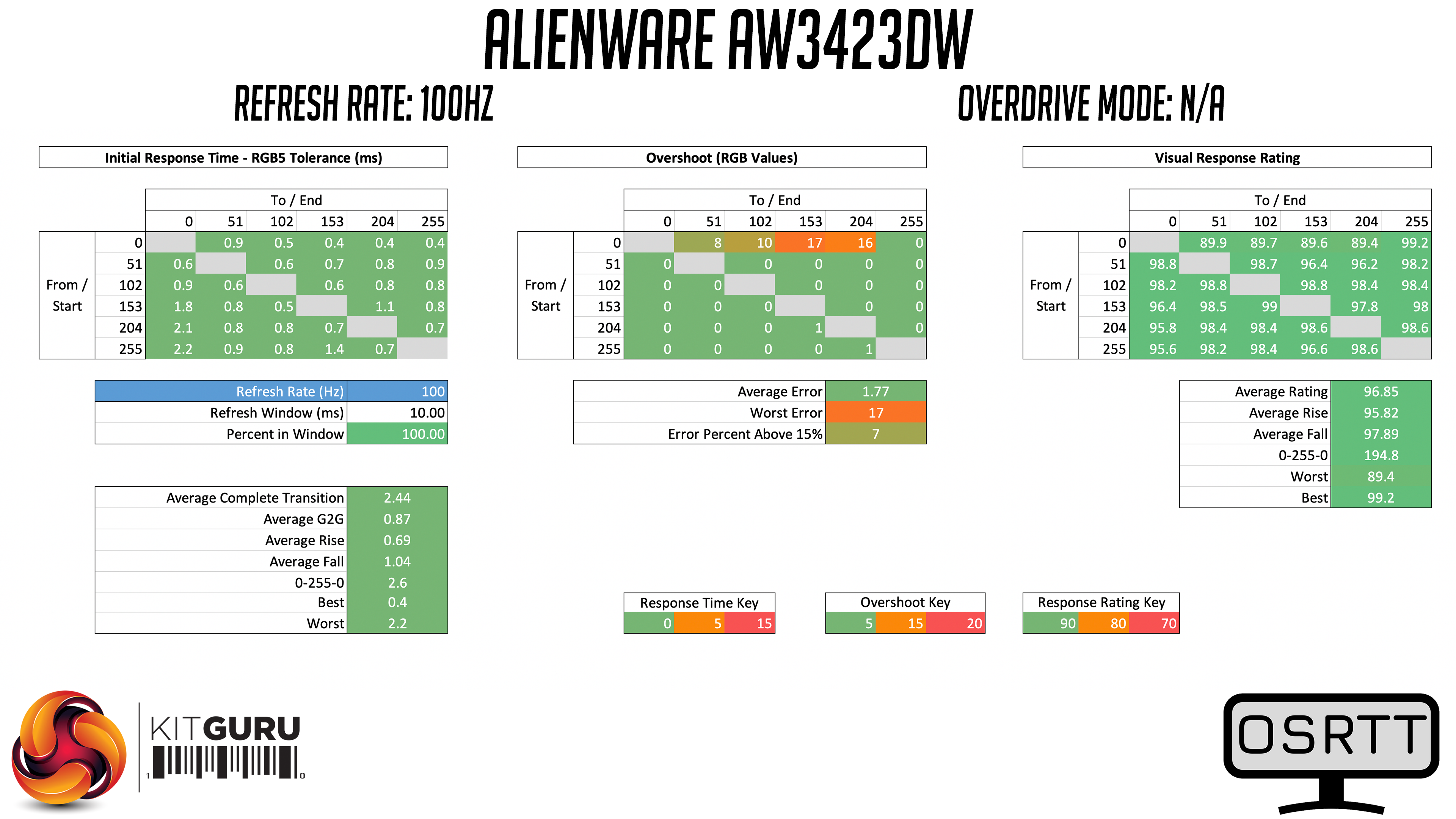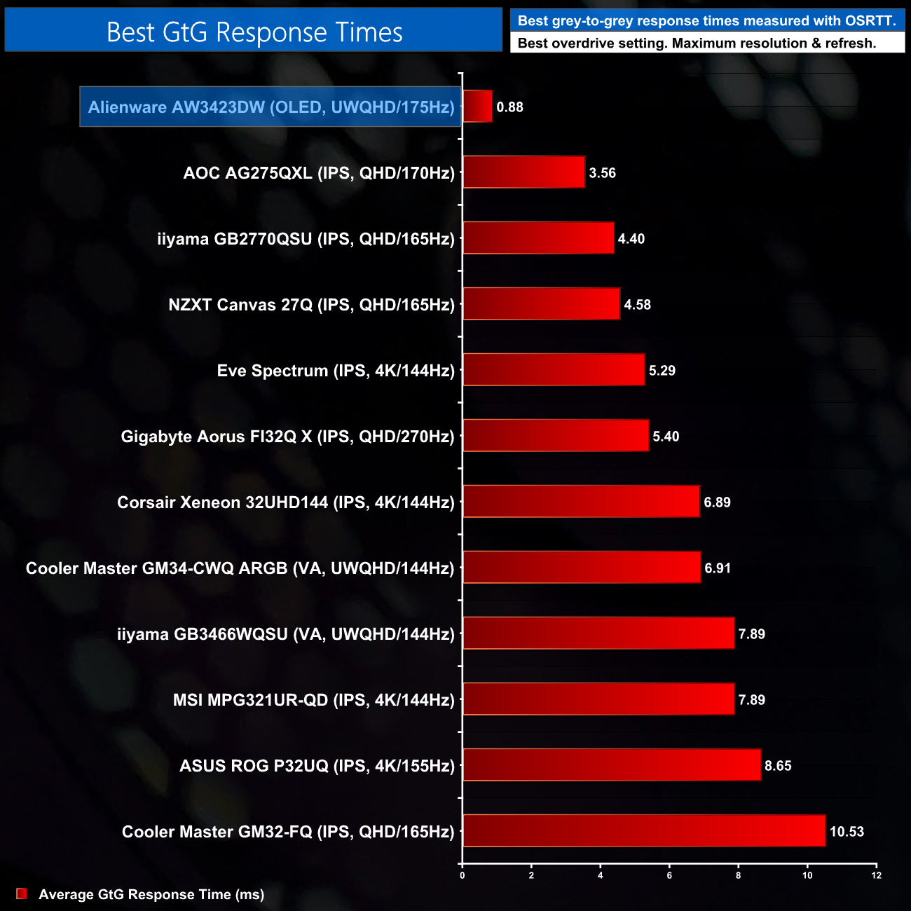 As expected, being the first and only OLED screen we have tested, the AW3423DW jumps to the top of our chart with its average GtG response time of 0.88ms. We hope to add more OLED screens to this chart in the coming weeks, but it does go to show how superior this display technology is compared to LCD panels in terms of the response times.
