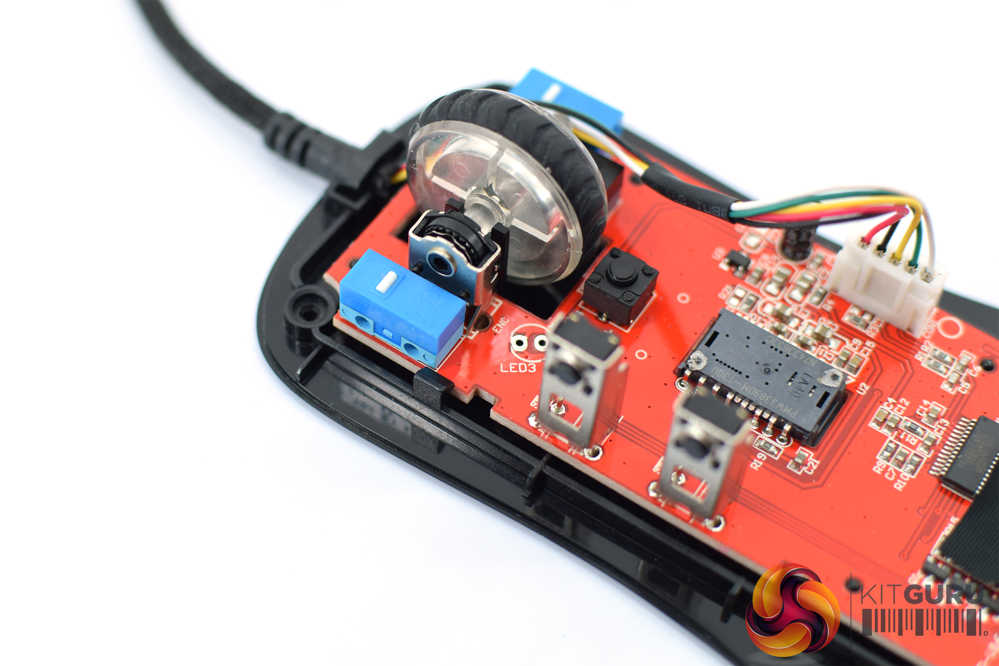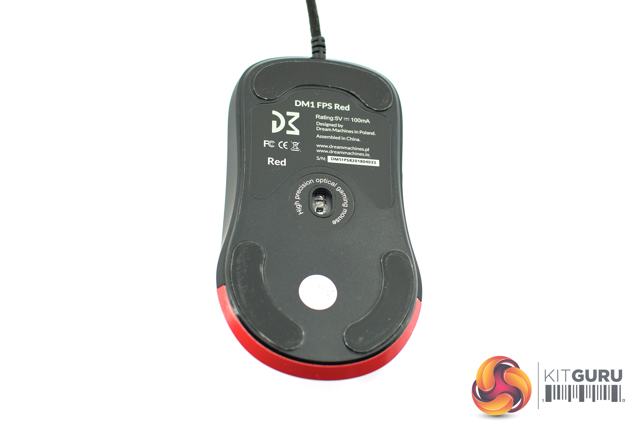Turning the mouse over reveals three mouse feet – one larger one at the top, and two slightly smaller feet at the bottom. The PMW 3389 sensor sits in the middle of the mouse.