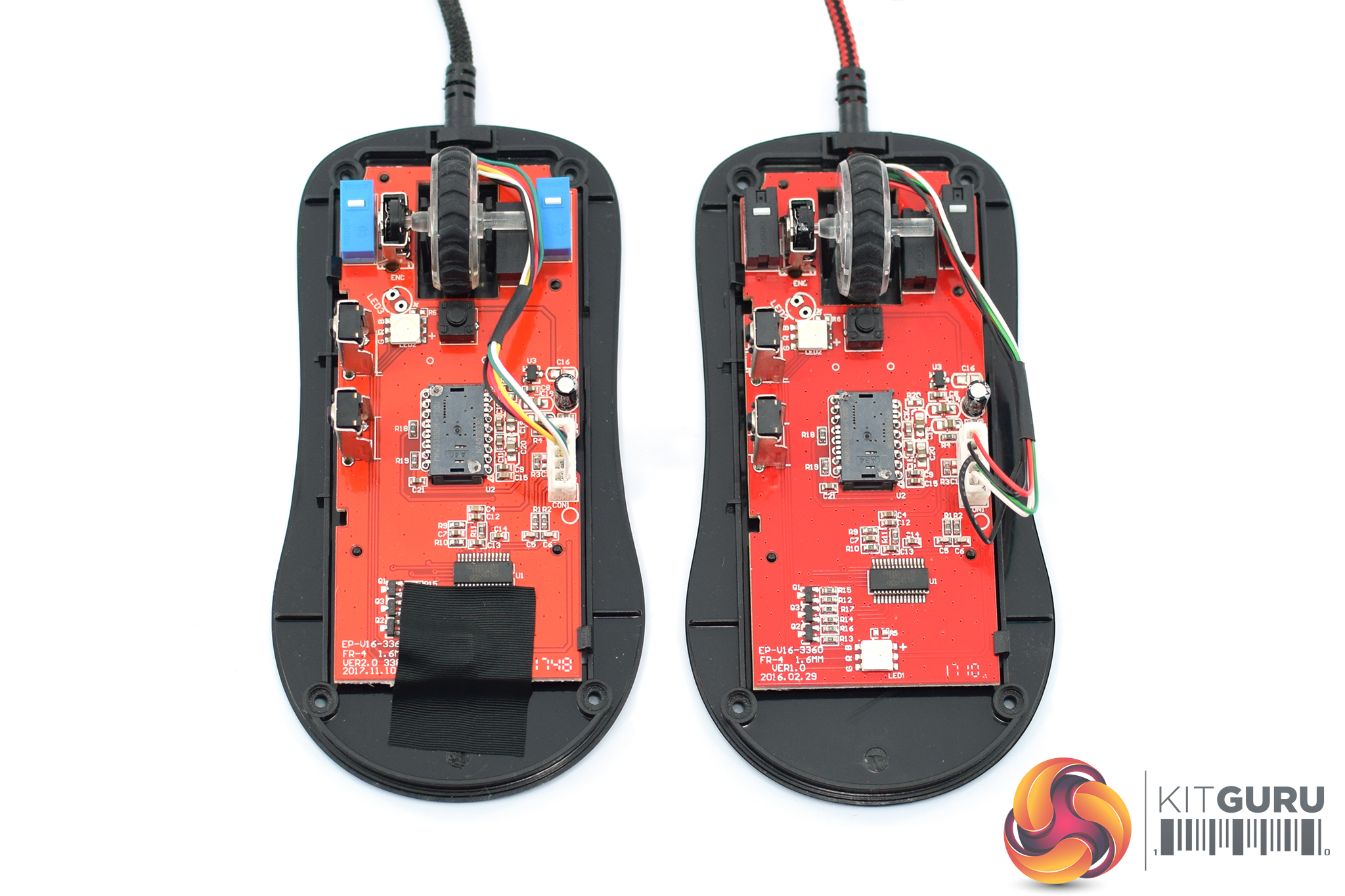Removing the three mouse feet on the underside of each mouse reveals four small screws – once these are removed, the top shell comes free and we can look at the internal PCB.