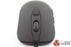 The scroll wheel is the second lighting zone, and just behind that we find a single DPI adjustment button. Either side of the scroll wheel are the two primary buttons – these use Omron switches rated at 20m clicks.