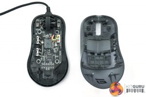 We can see most of the primary differences versus the original XM1 when opening up the shell. First of all, Endgame Gear is now using Kailh GM 8.0 switches for the XM1r's primary buttons, when the XM1 uses Omron D2FC-F-K(50M). The scroll wheel uses a Japanese ALPS encoder, with a Kailh switch used for the scroll click.