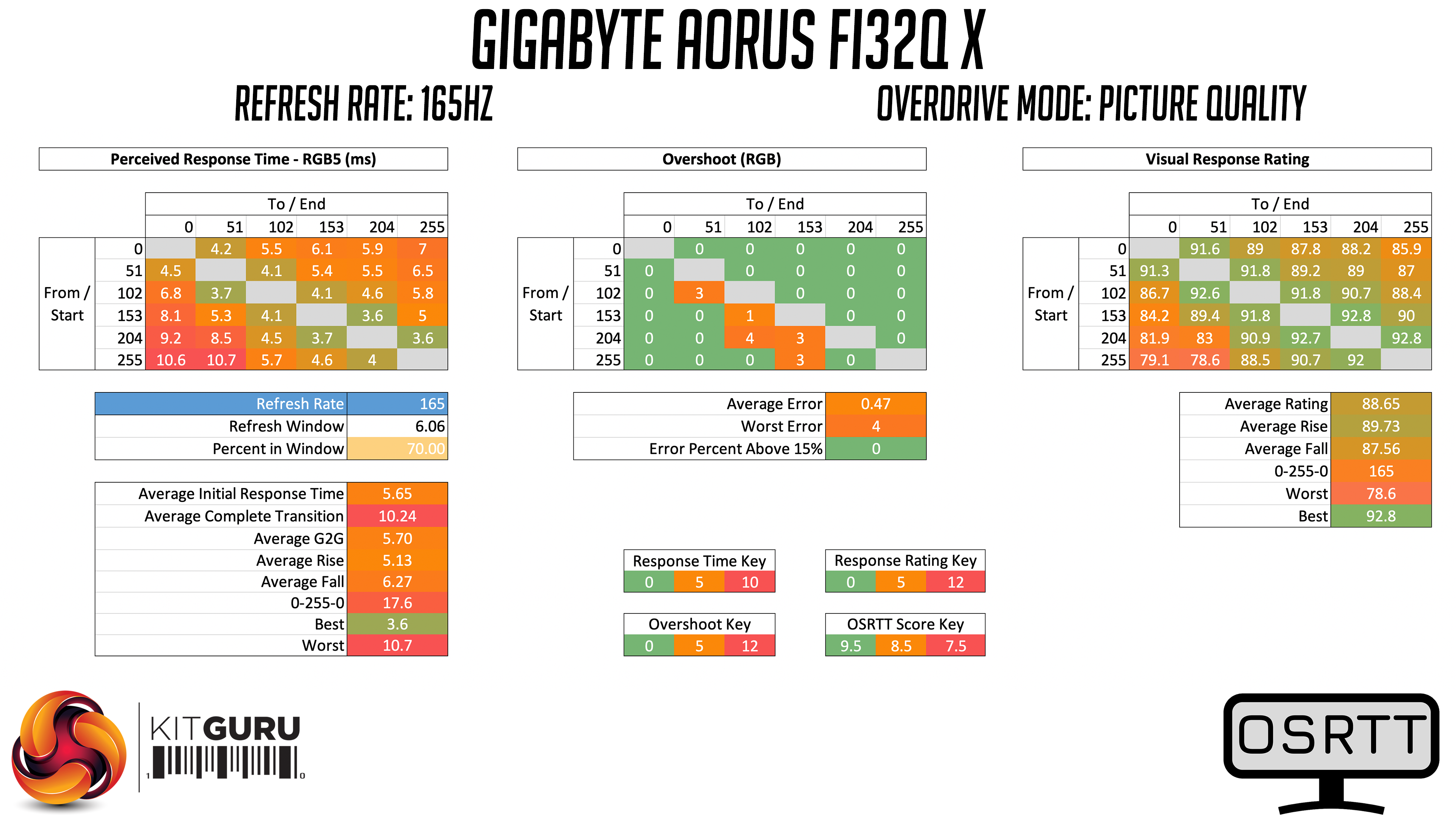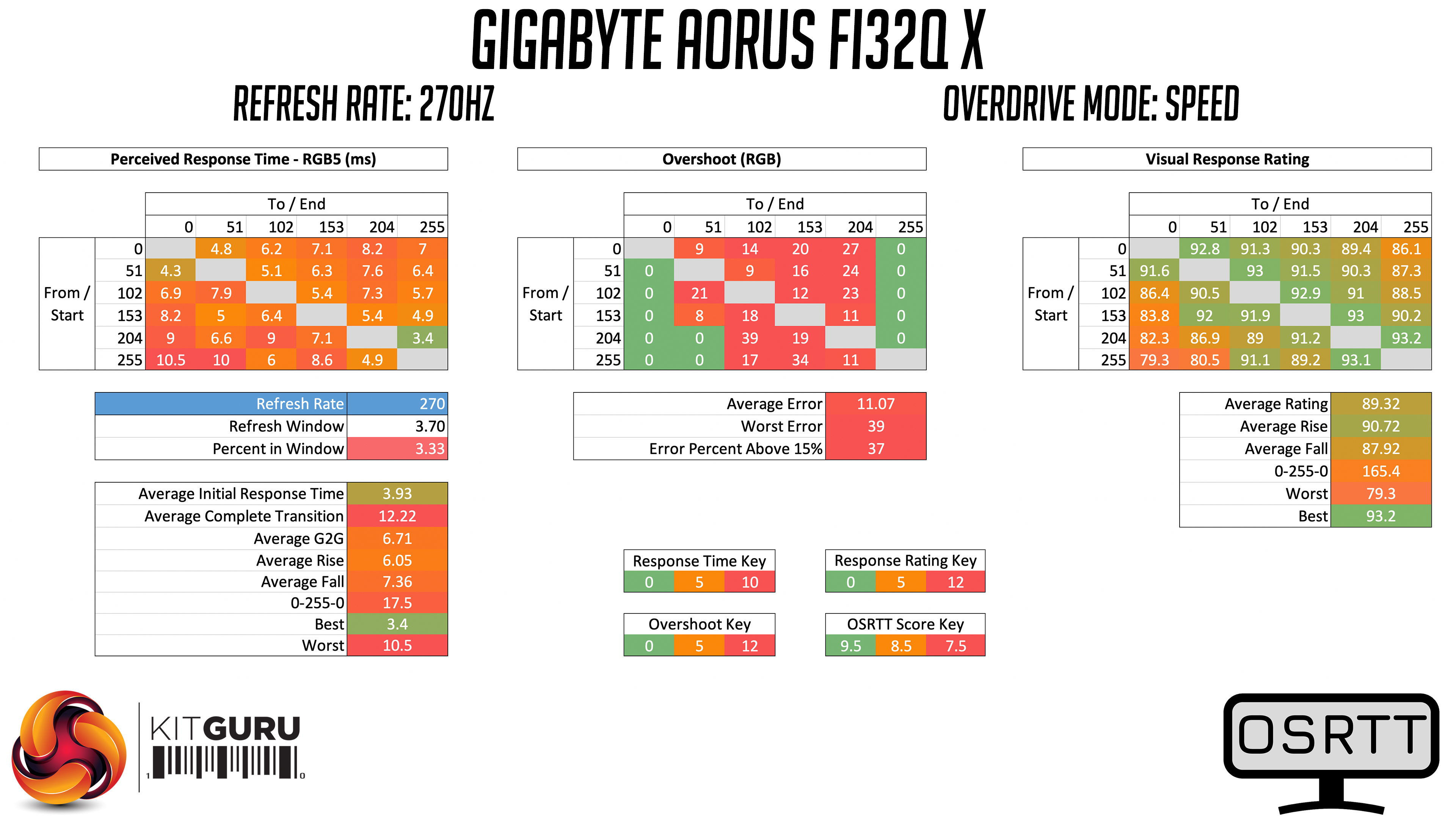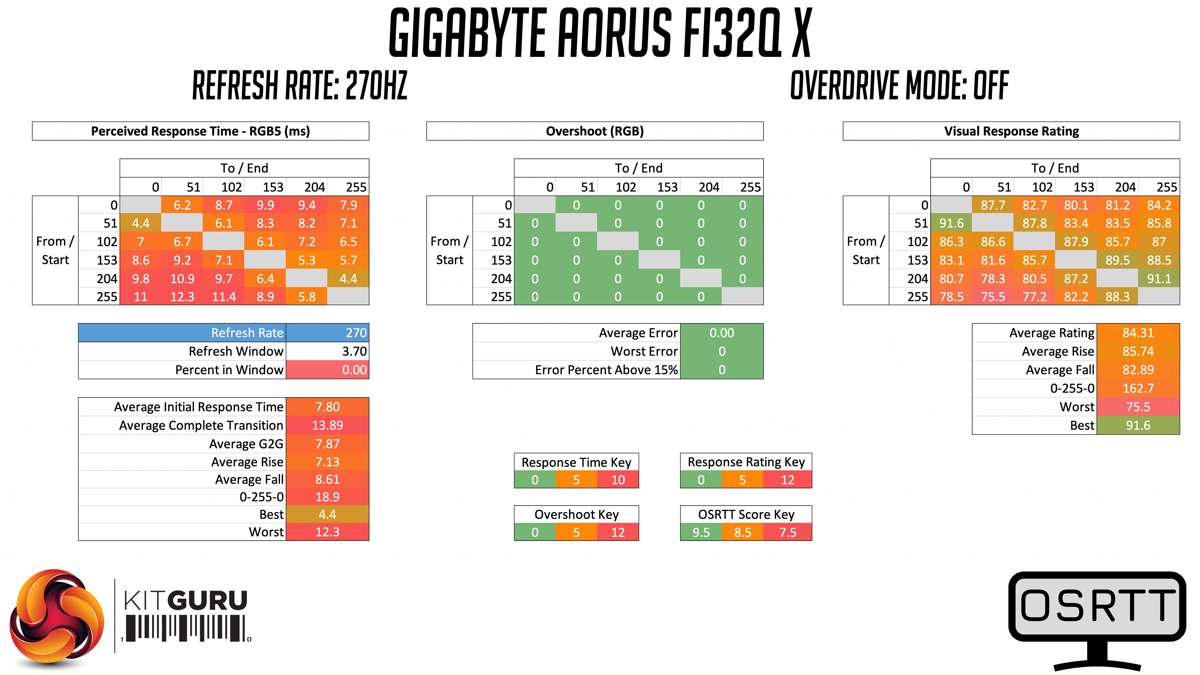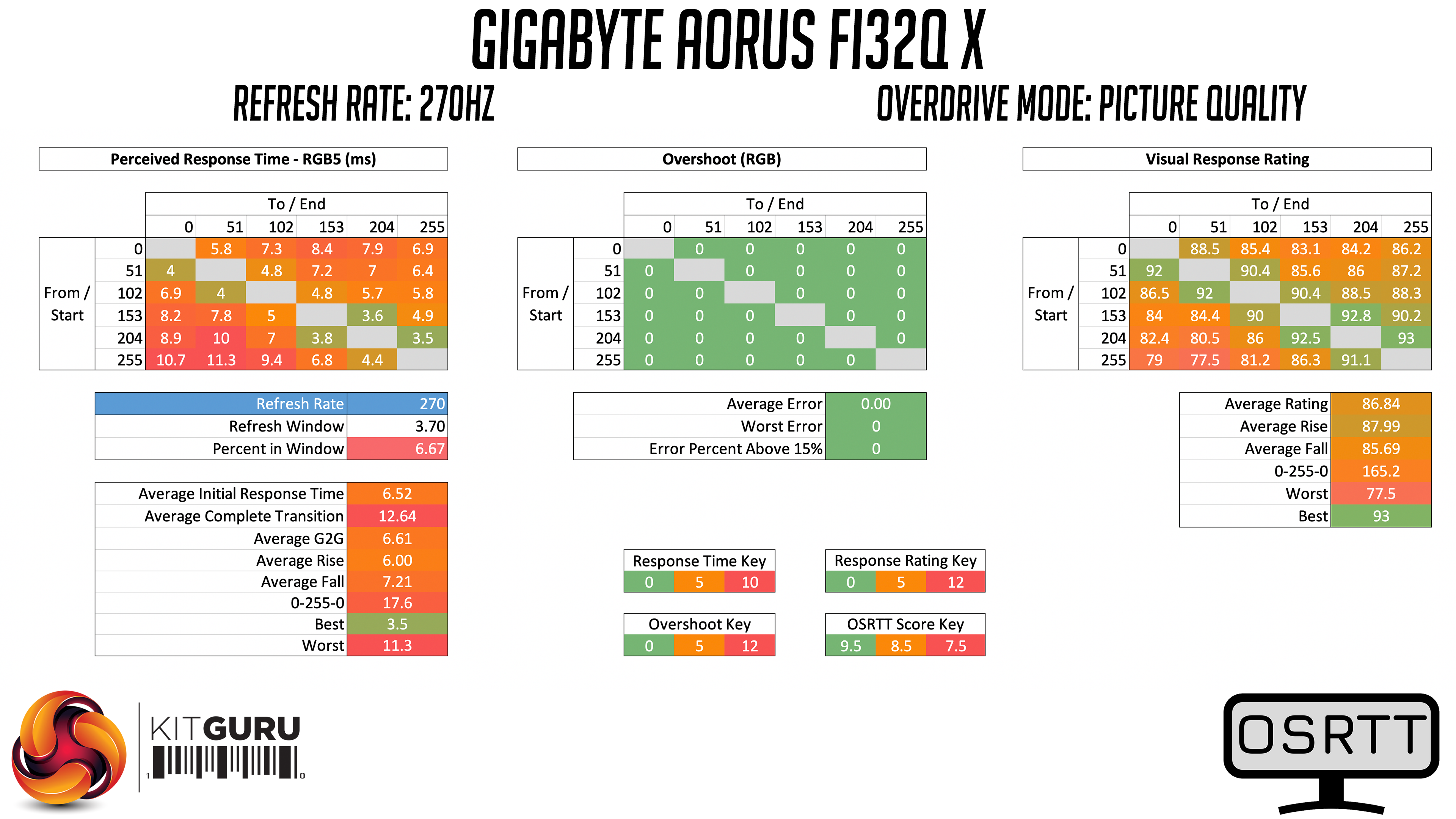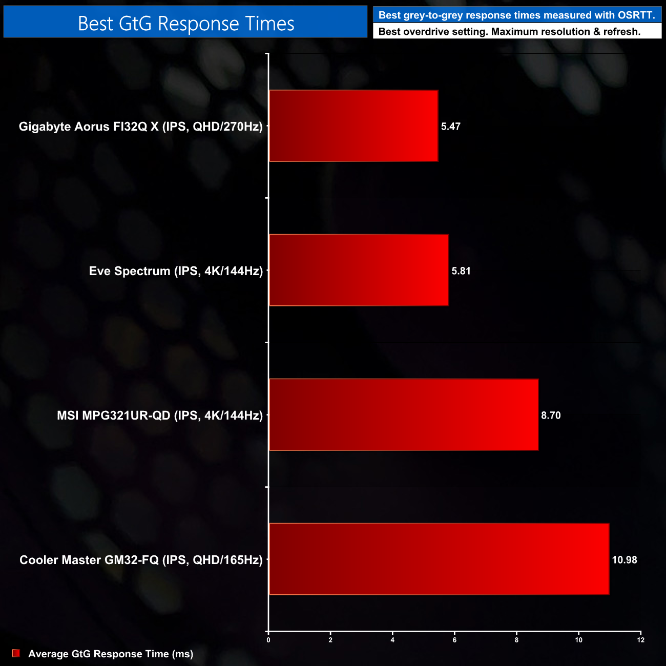 Rounding out our testing with a head-to-head comparison, looking at our screens' average GtG performance using their best respective overdrive modes, we can see the FI32Q X takes top spot with its result of 5.47ms. We've only just started using OSRTT in our reviews so there is clearly a lot of work to be done adding in other monitors, but right now the FI32Q X is heading up our chart.