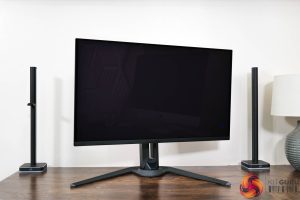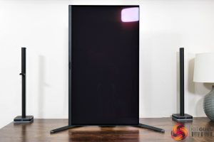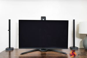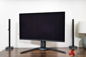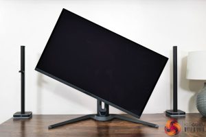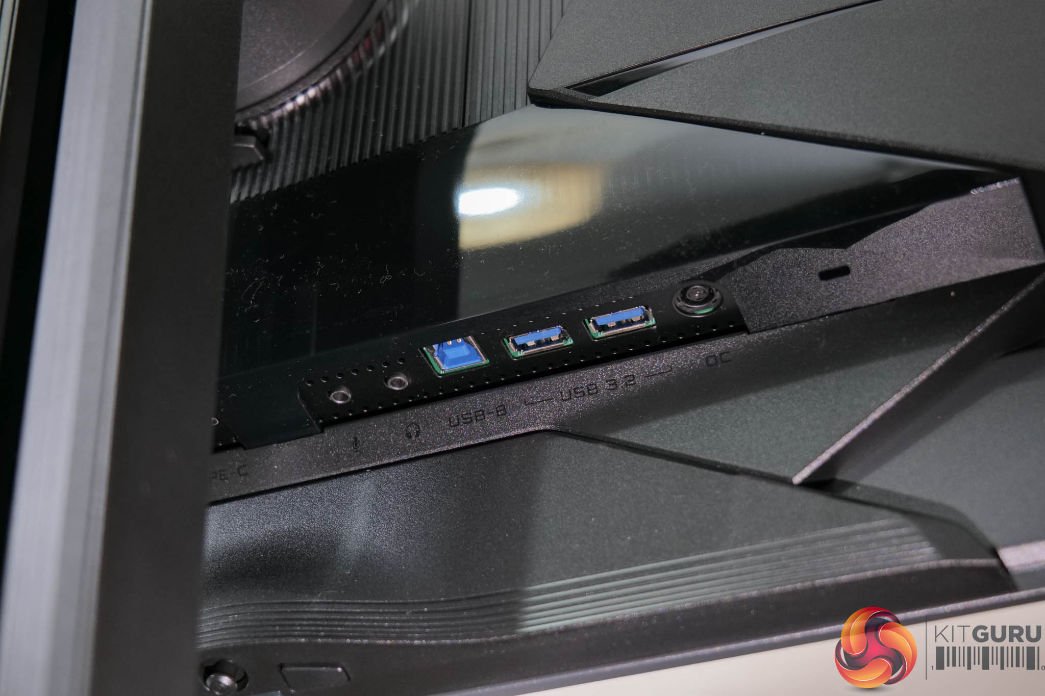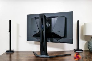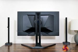 As for the I/O, this is split across two sections on the back of the monitor. One half houses the video inputs, with 2x HDMI 2.1, 1x DisplayPort 1.4 and 1x USB-C that supports DP-Alt mode and 18W power delivery. In the other half we find headphone and mic jacks, one USB-B upstream which feeds two Type-A downstream ports, as well as the power input.