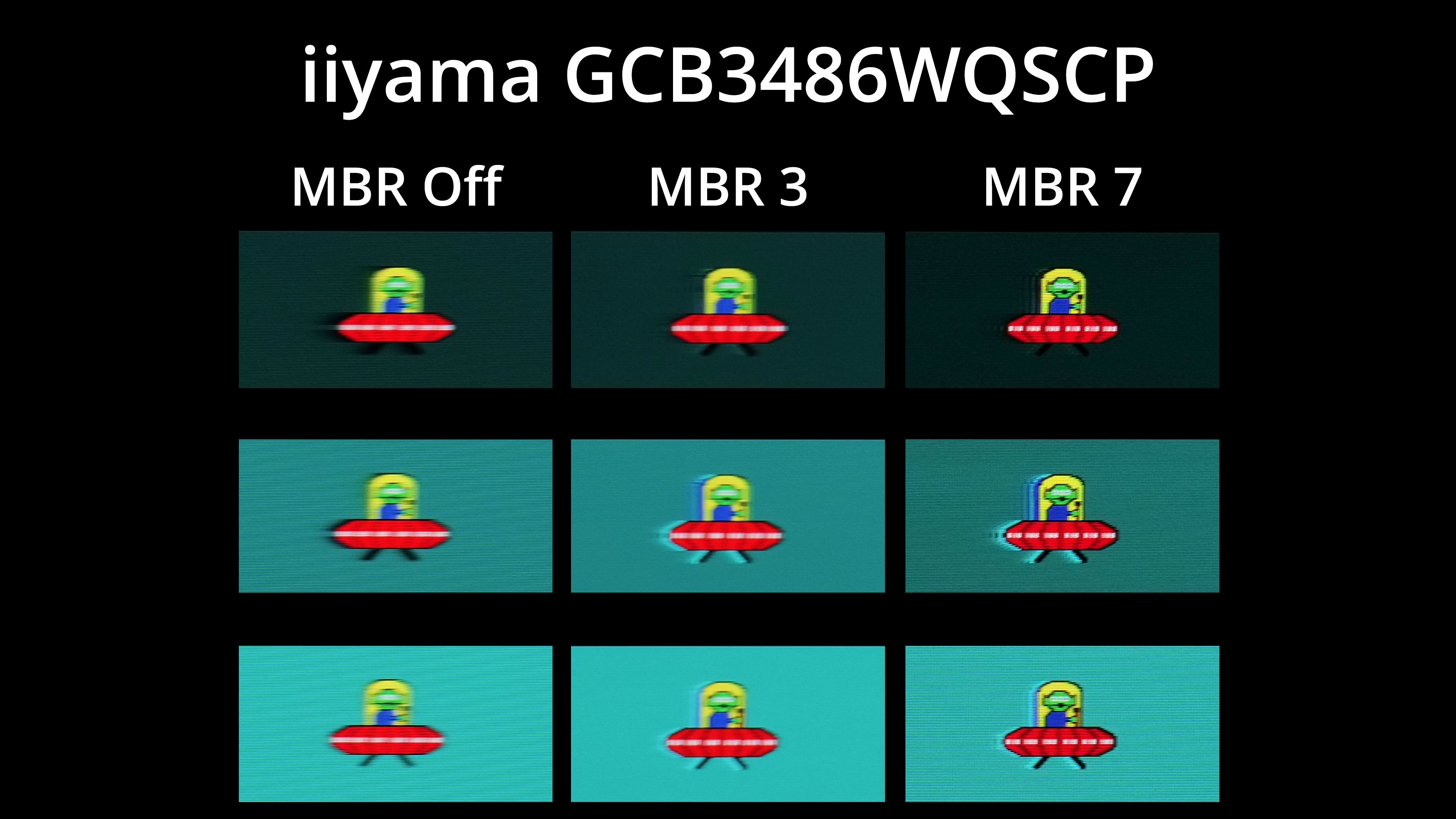 iiyama does have one final setting to try and improve things though, that being Motion Blu Reduction, AKA backlight strobing. There's seven different settings to try, but there's a few clear downsides so ultimately I don't think MBR is worth using. For one, it forces the overdrive setting 5, resulting in a lot of overshoot, which I don't quite understand, while there's also some visible signal cross-talk, resulting in a double-image effect. On top of that, the MBR 7 setting offers the best clarity, but it also caps brightness at below 140 nits and it cannot be used with adaptive sync, so I think that will rule it out for a lot of people.