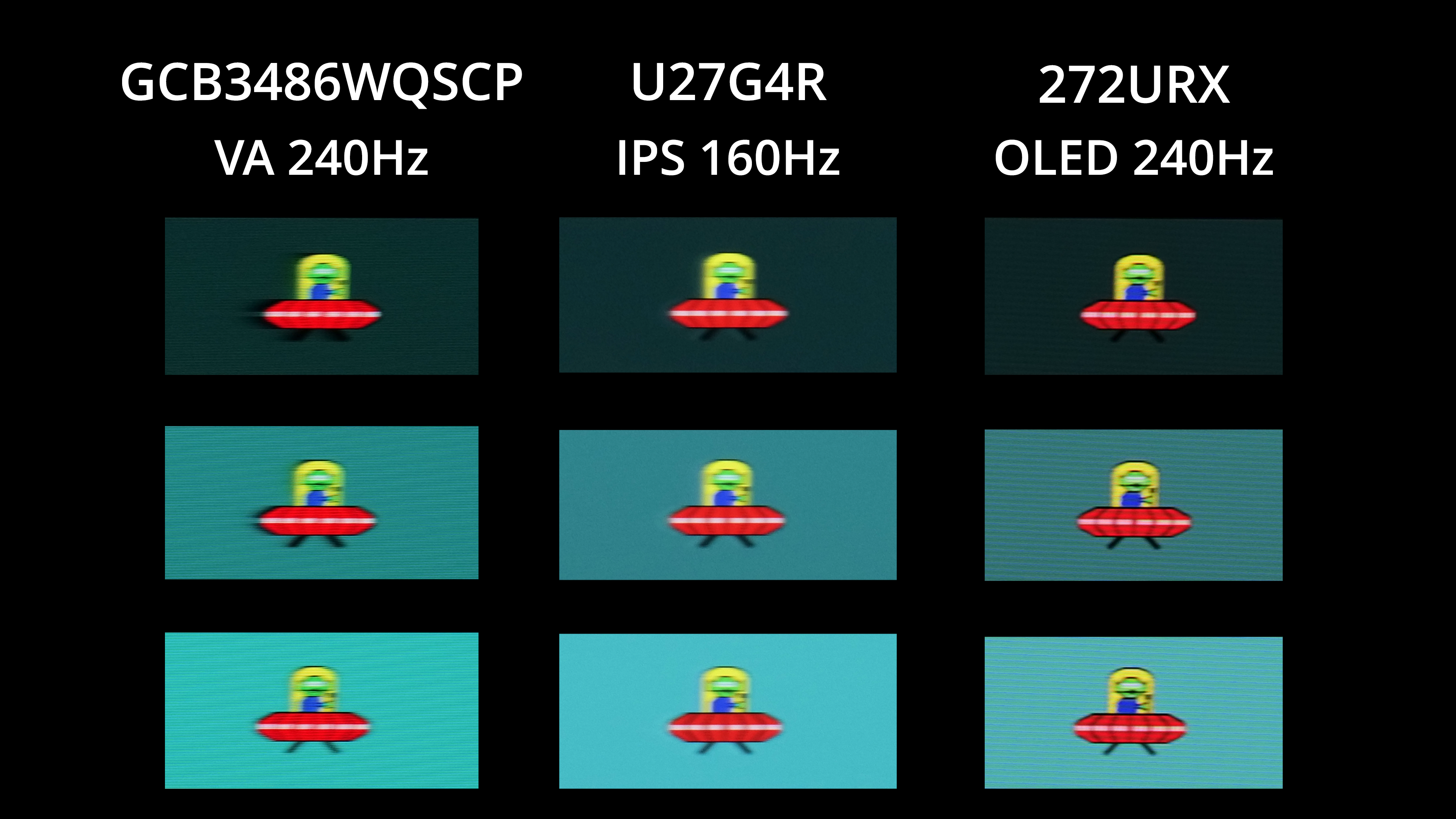 For some comparisons then, I've roped in the AOC U27G4R we reviewed recently, and despite the iiyama monitor offering a higher refresh rate, motion clarity is fairly similar between the two, though you can clearly see the difference the dark-level smearing makes versus an IPS panel which doesn't have that issue. Just for fun, I also included the MSI 272URX, a 240Hz OLED monitor which is setting the standard for motion clarity and response times – though it also costs over twice as much as the iiyama!