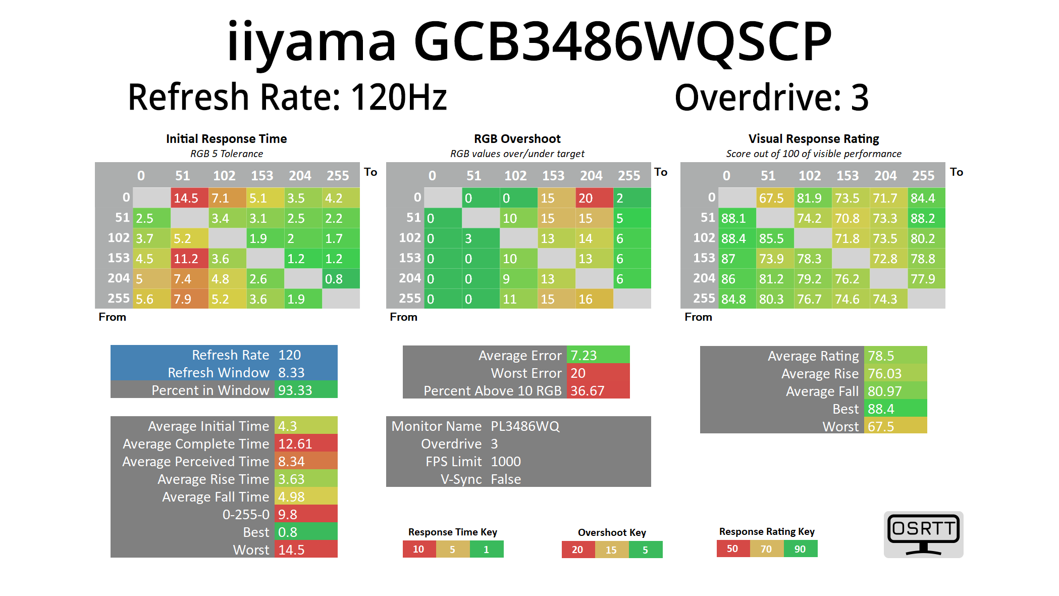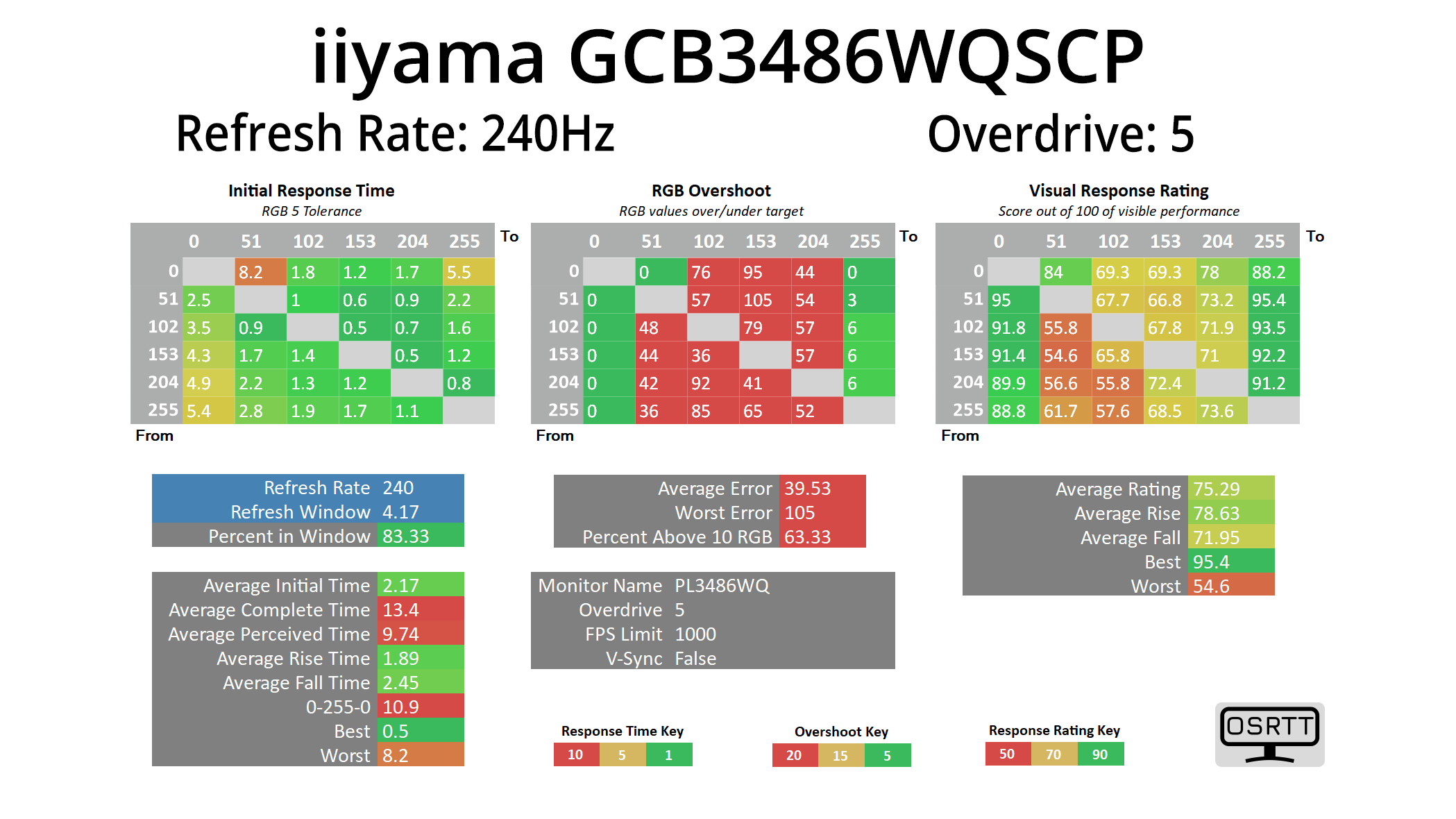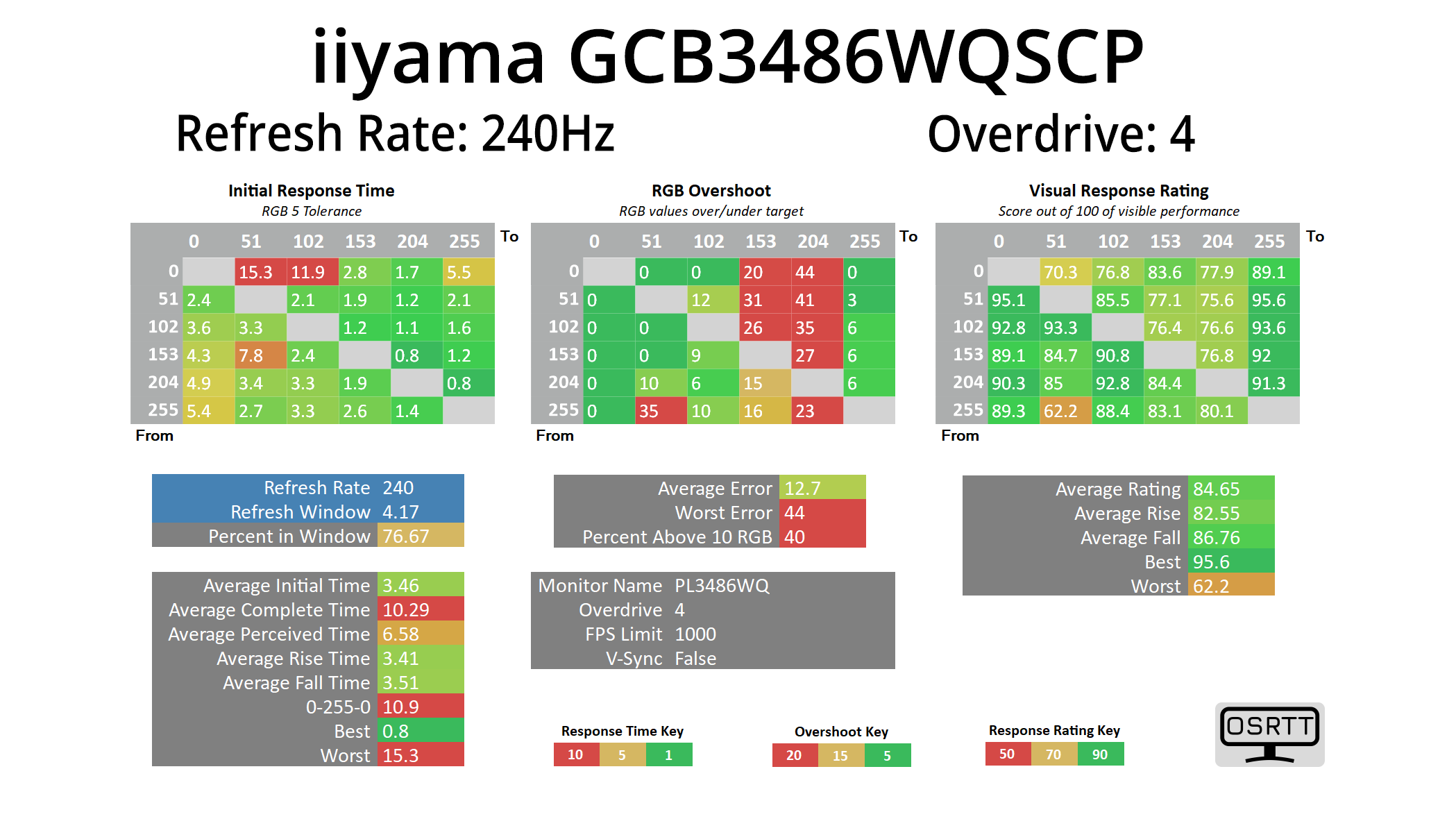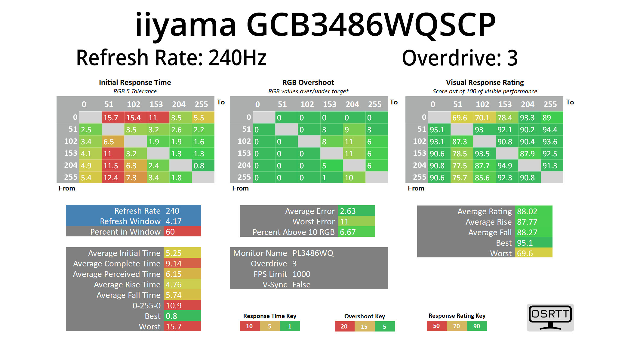 We use the Open Source Response Time Tool (OSRTT), developed by TechTeamGB, for our response time testing. This measures grey-to-grey response times and presents the results in a series of heatmaps, the style of which you may be familiar with from other reviews.