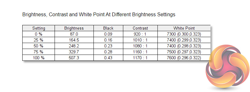 Next up is overall brightness and I was quite surprised to see the GB2770QSU exceeding 500 cd/m2 when set to 100%, especially considering iiyama only claims up to 400 cd/m2 brightness for the panel! Likewise, a contrast ratio of 1170:1 is a great result for an IPS display, particularly one of this price-point. My only concern with the data shown above is the white point, coming in somewhat cool at 7300-7600K.