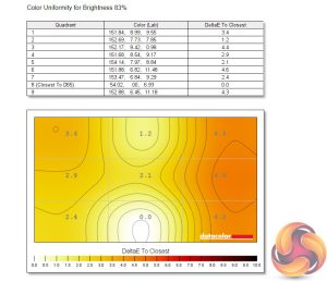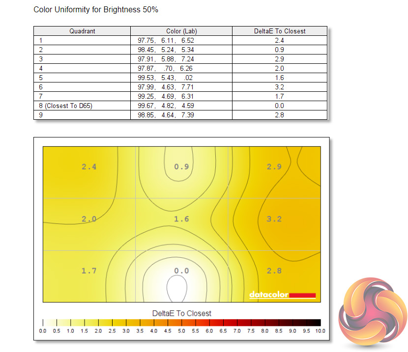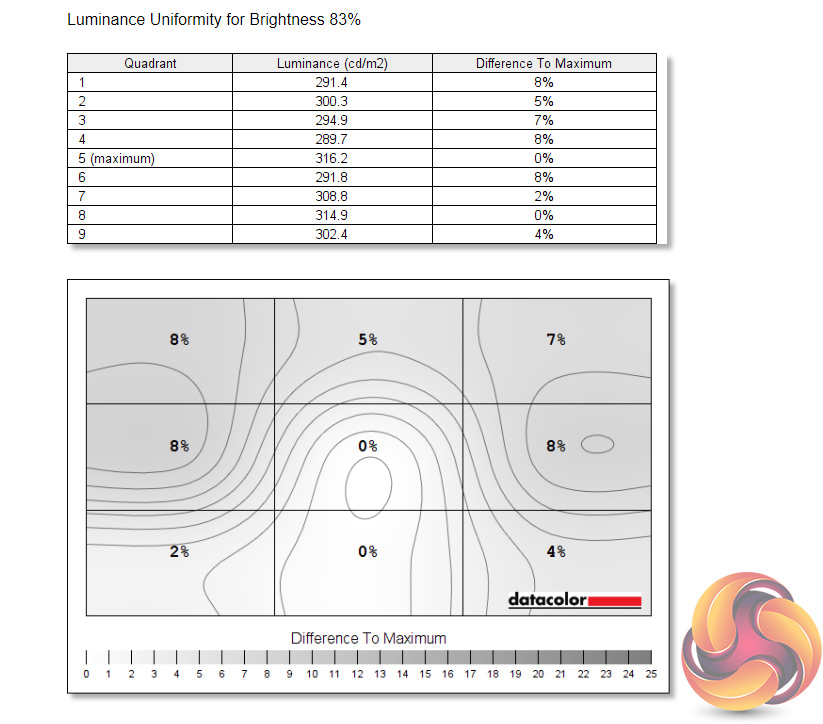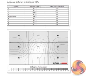 Luminance uniformity is more impressive though, with no more than 10% deviation being registered across the panel, and that was in the top left corner.