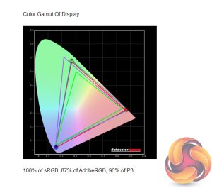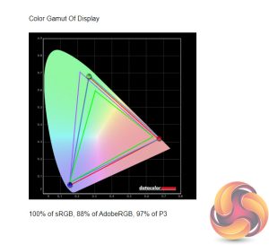 Kicking off panel testing with our gamut coverage, the GB2770QSU gets off to a good start here – we see 100% sRGB coverage, plus 88% AdobeRGB and 97% DCI-P3 reporting.