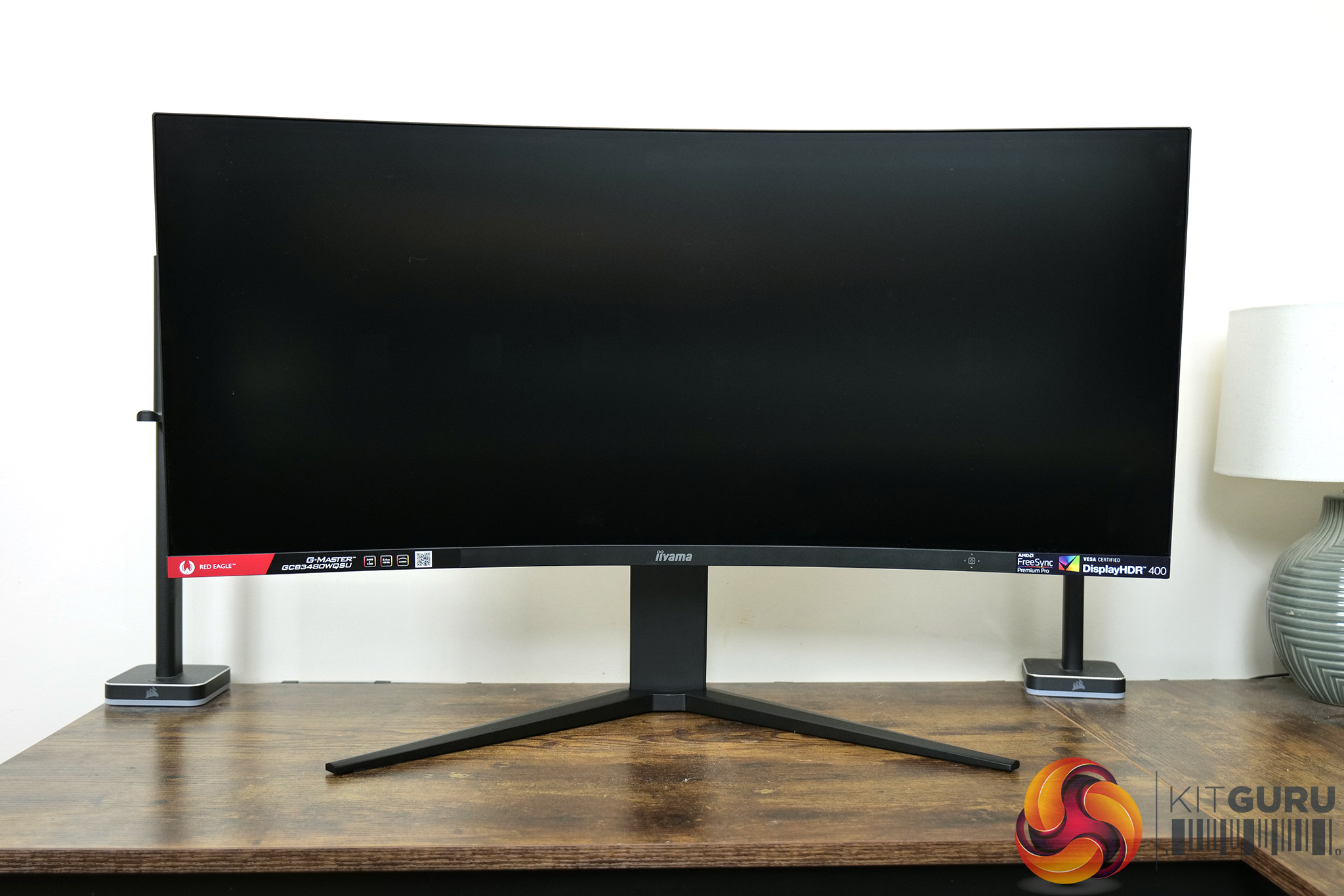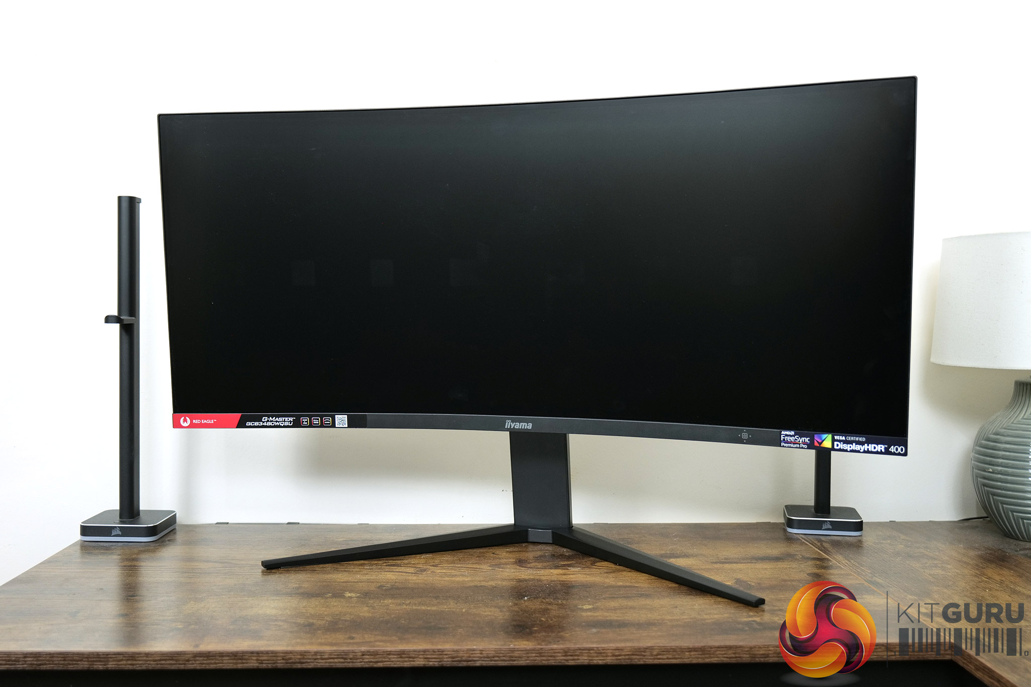 Kicking off with a look at the design of the GCB3480WQSU, in true iiyama fashion it is a very stripped back monitor. It's almost entirely made of matte black plastic, and those flashes of colour you can see on the bottom bezel are actually removable stickers. It has a 3-side frameless design, while the chin measures approximately 17mm thick.