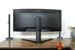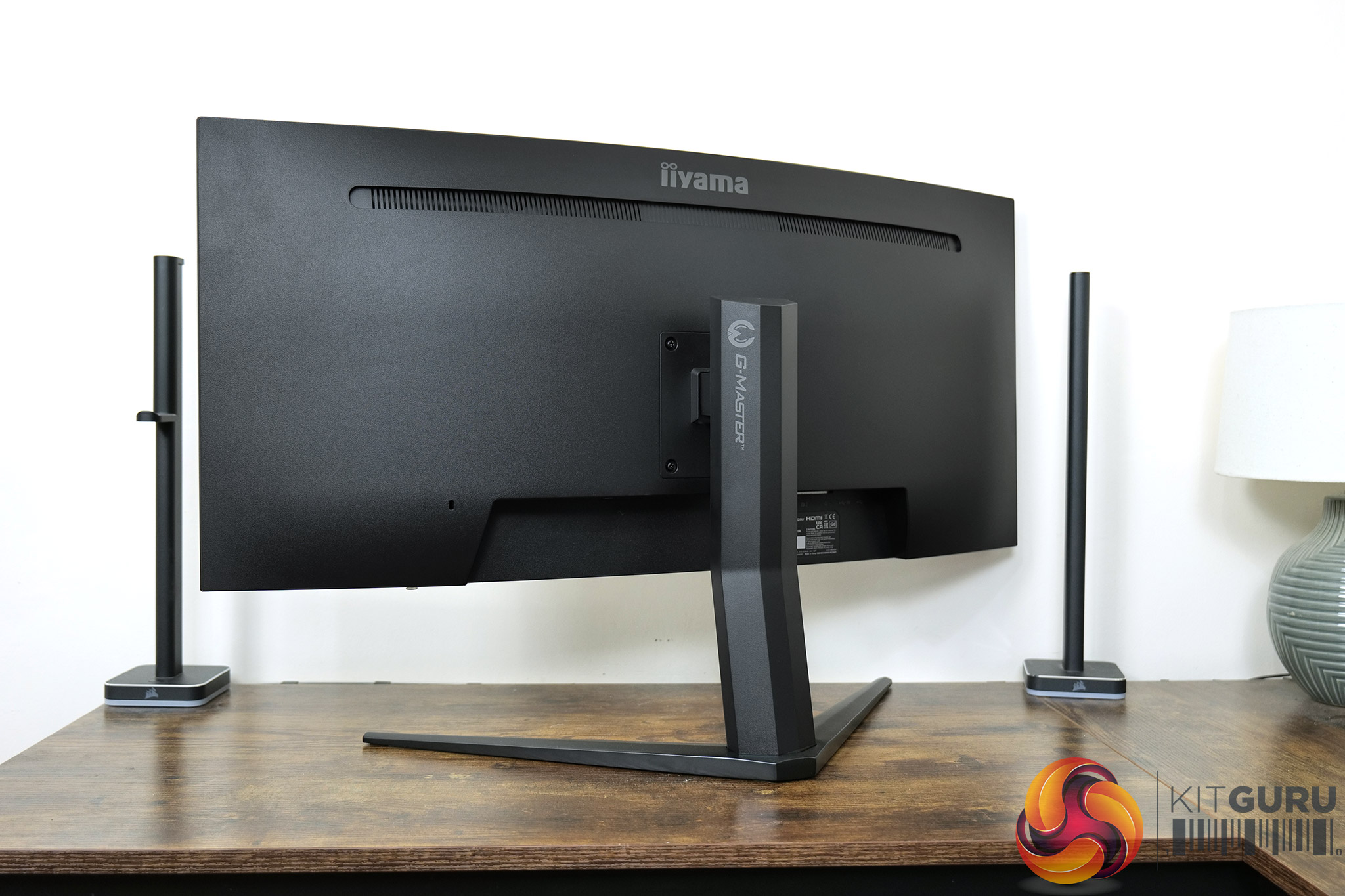 Round the back, there's more matte black plastic, with a small iiyama logo printed in grey at the top, just above some ventilation cutouts. The stand is also visible, with a v-shaped foot that is typical of most ultrawide screens.